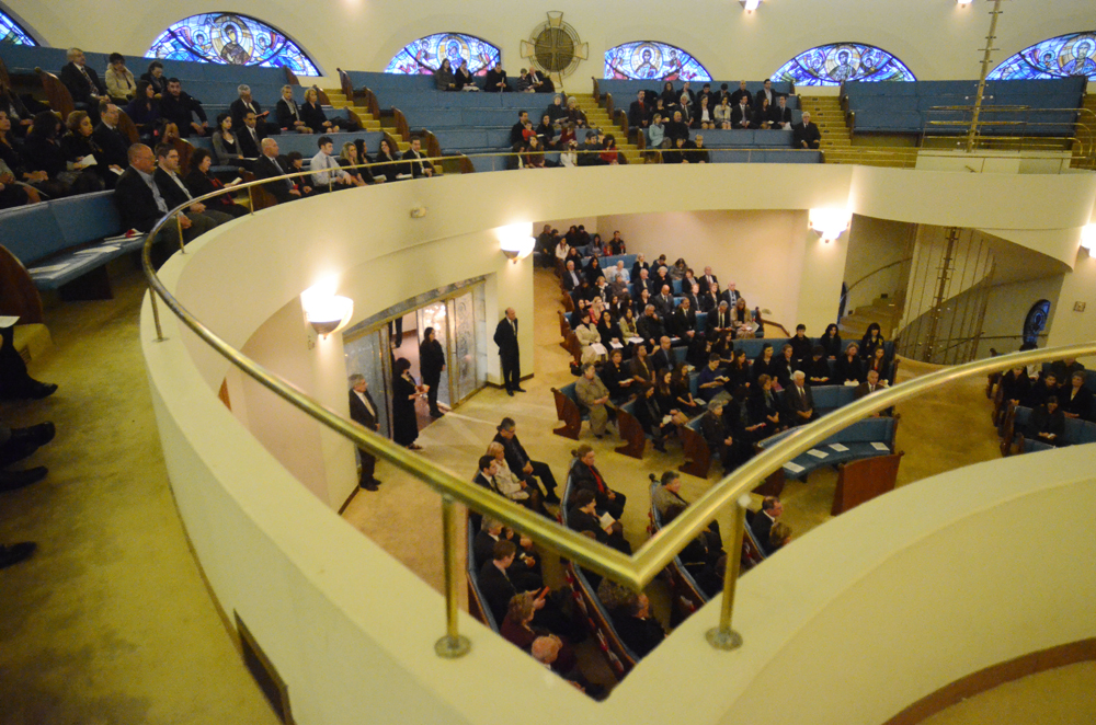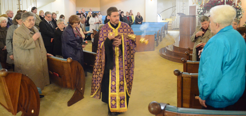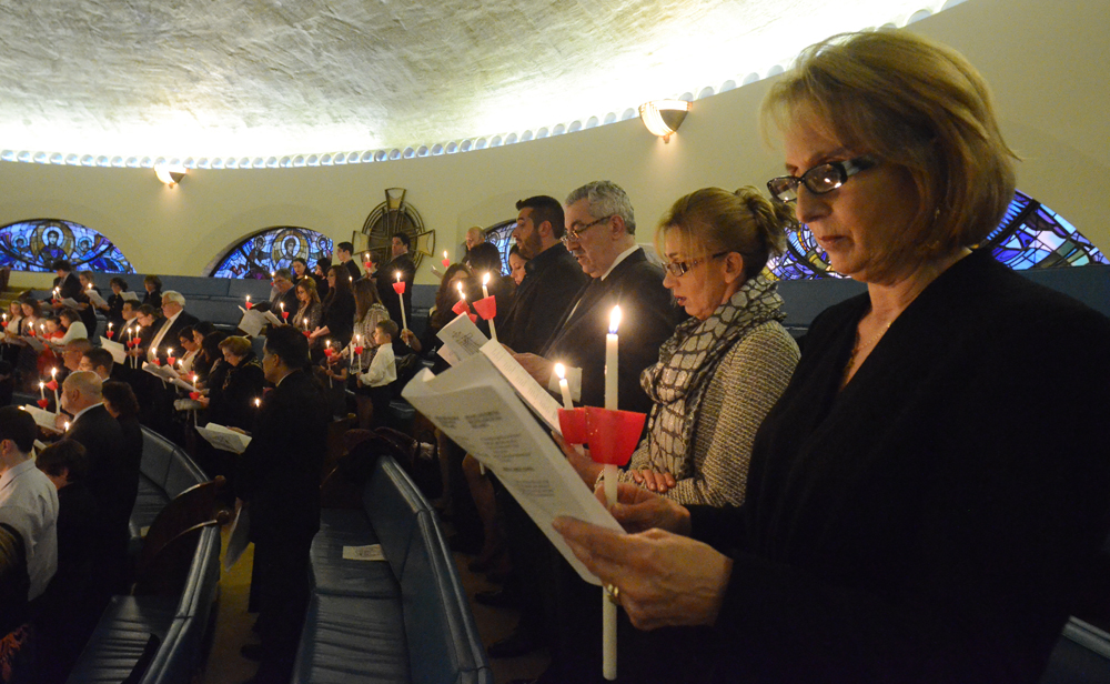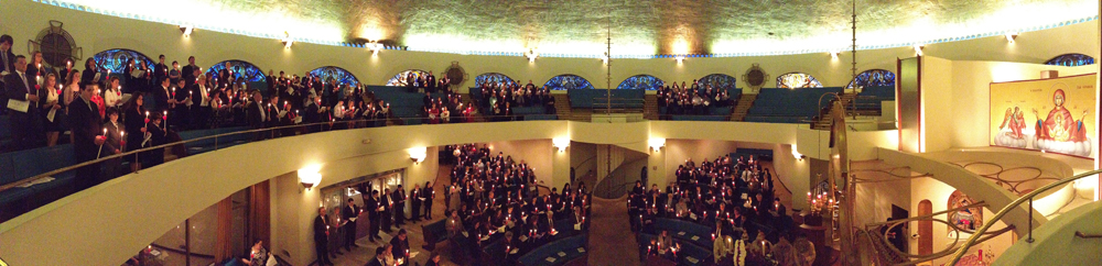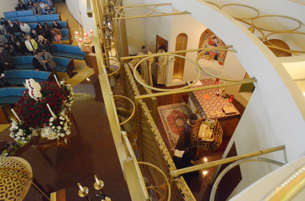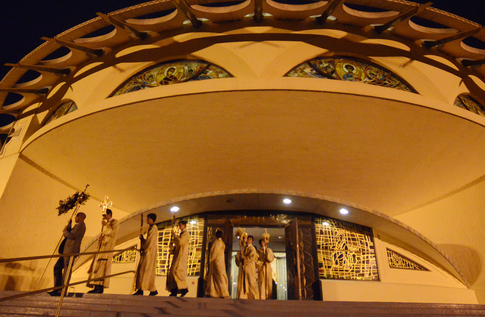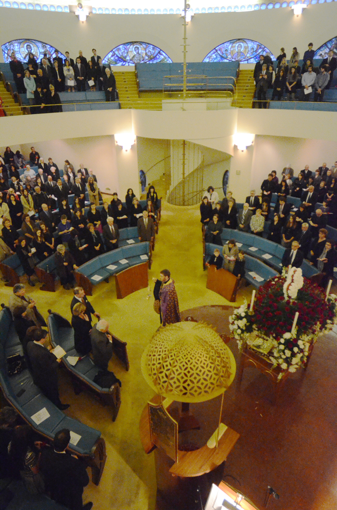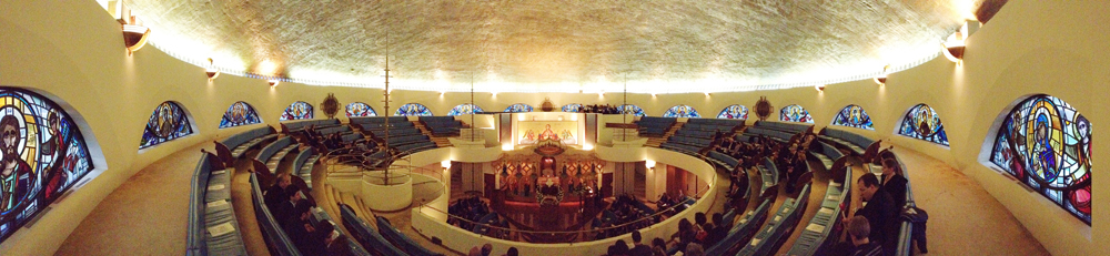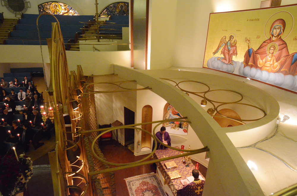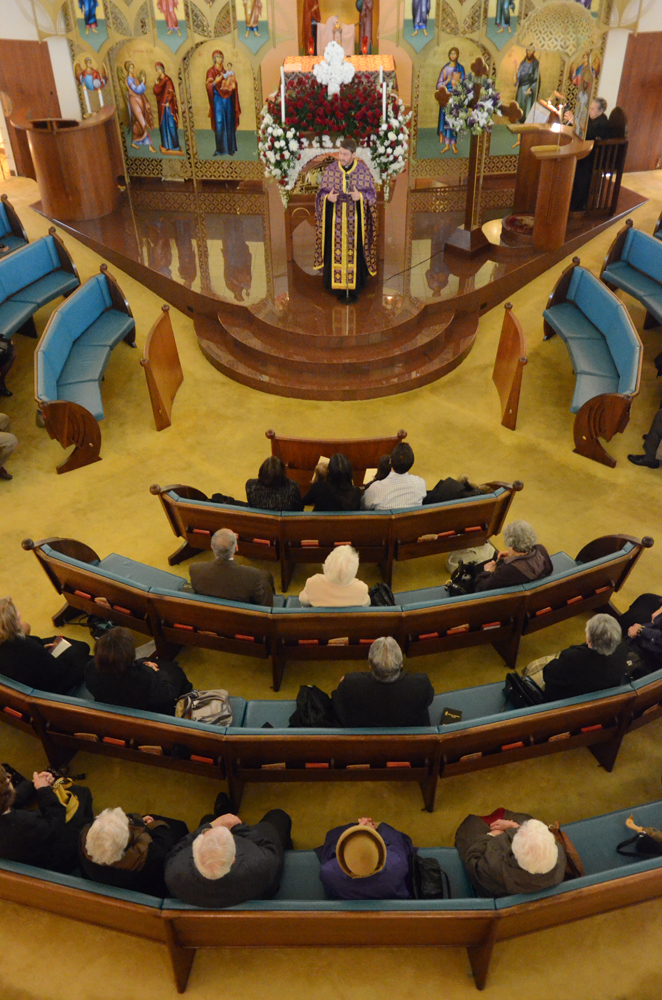 I came there as an architectural photographer, but photographed as a photojournalist, to show how the building works for its intended purpose, as an ecclesiastical building. I was allowed to shoot from wherever I wanted to go during the services, and was warmly welcomed by the congregation. The photos that follow show the service and rich traditions of the church, as well as the building. They are in order: first, the afternoon vespers service, and then the candlelit evening service, which included a procession around the outside of the church.