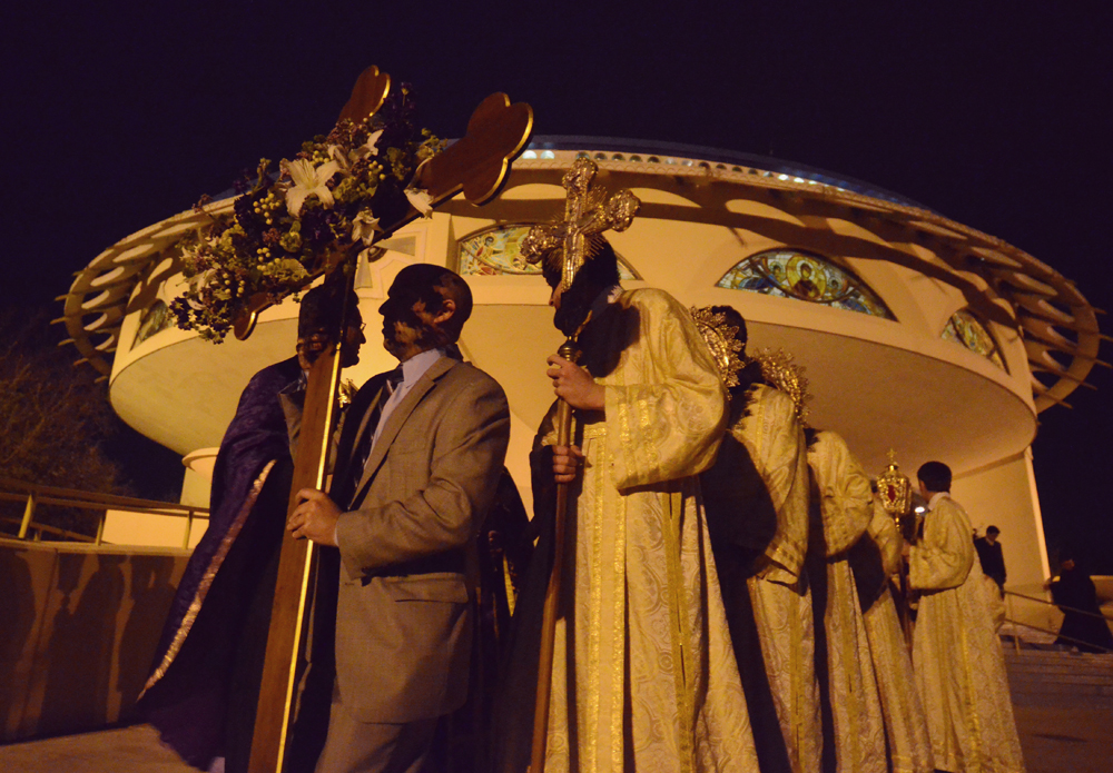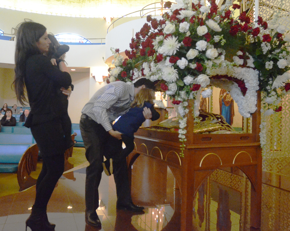 ImageAt the end of the service congregants, including children, express their reverence as they kiss the Gospel, the cross, and art work of the crucifixion of Christ which are displayed in a flower-decorated symbolic representation of the empty tomb of Christ. The empty tomb is part of the procession outside the church during the evening service, below:
