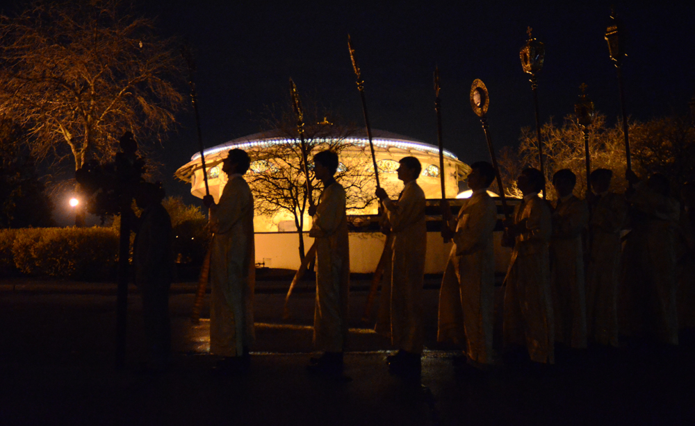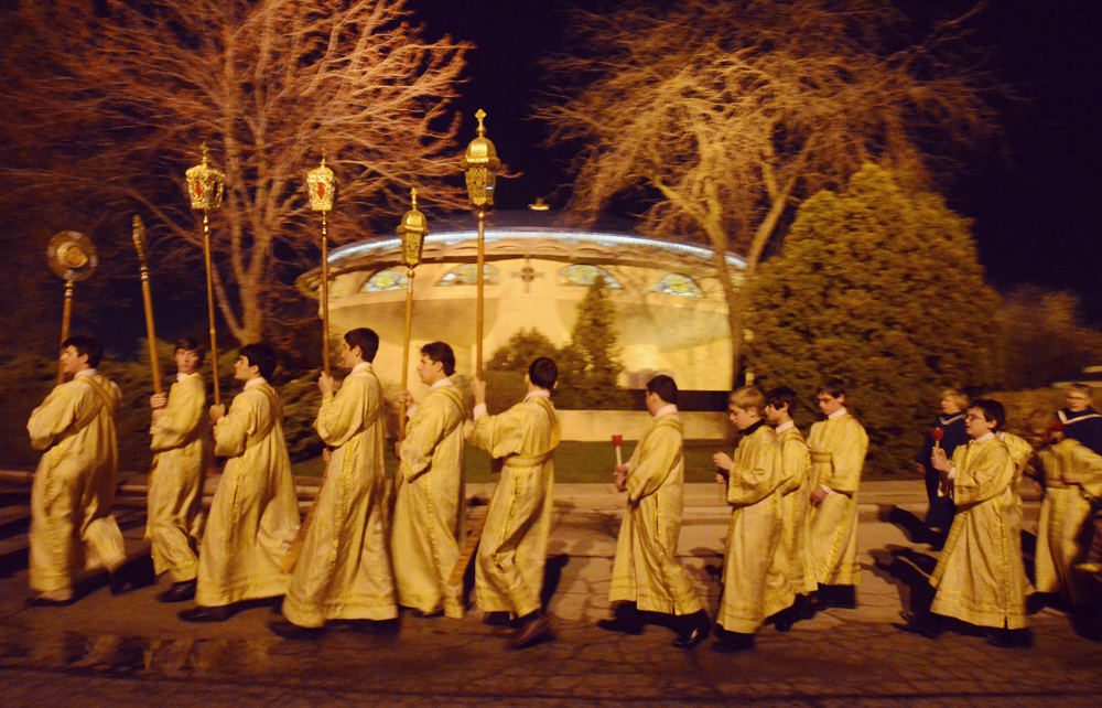 Father David Hostetler holds the Gospel aloft during a procession around the sanctuary