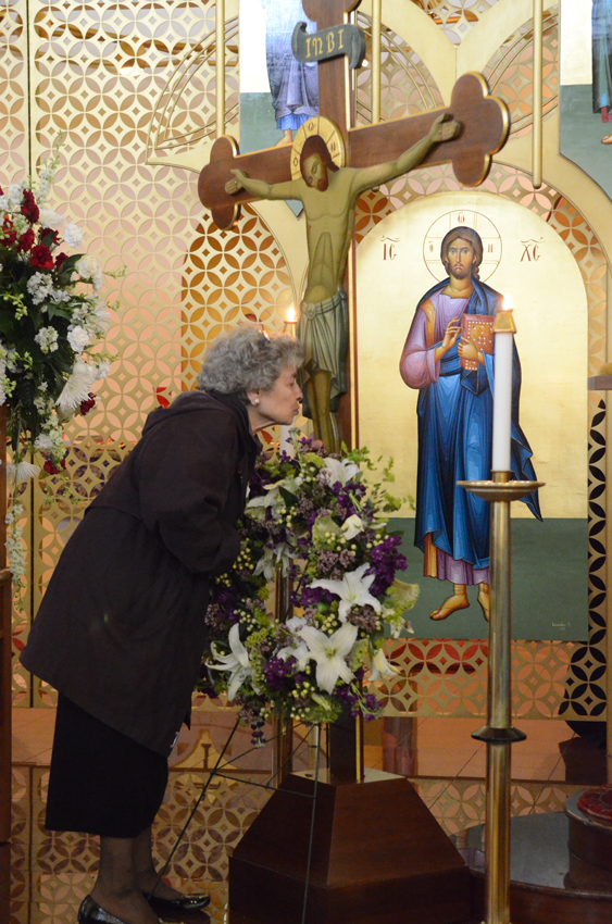 Father Angelo Artemas gives congregants flowers from the symbolic empty tomb, as they kiss his hand at the end of the evening service.