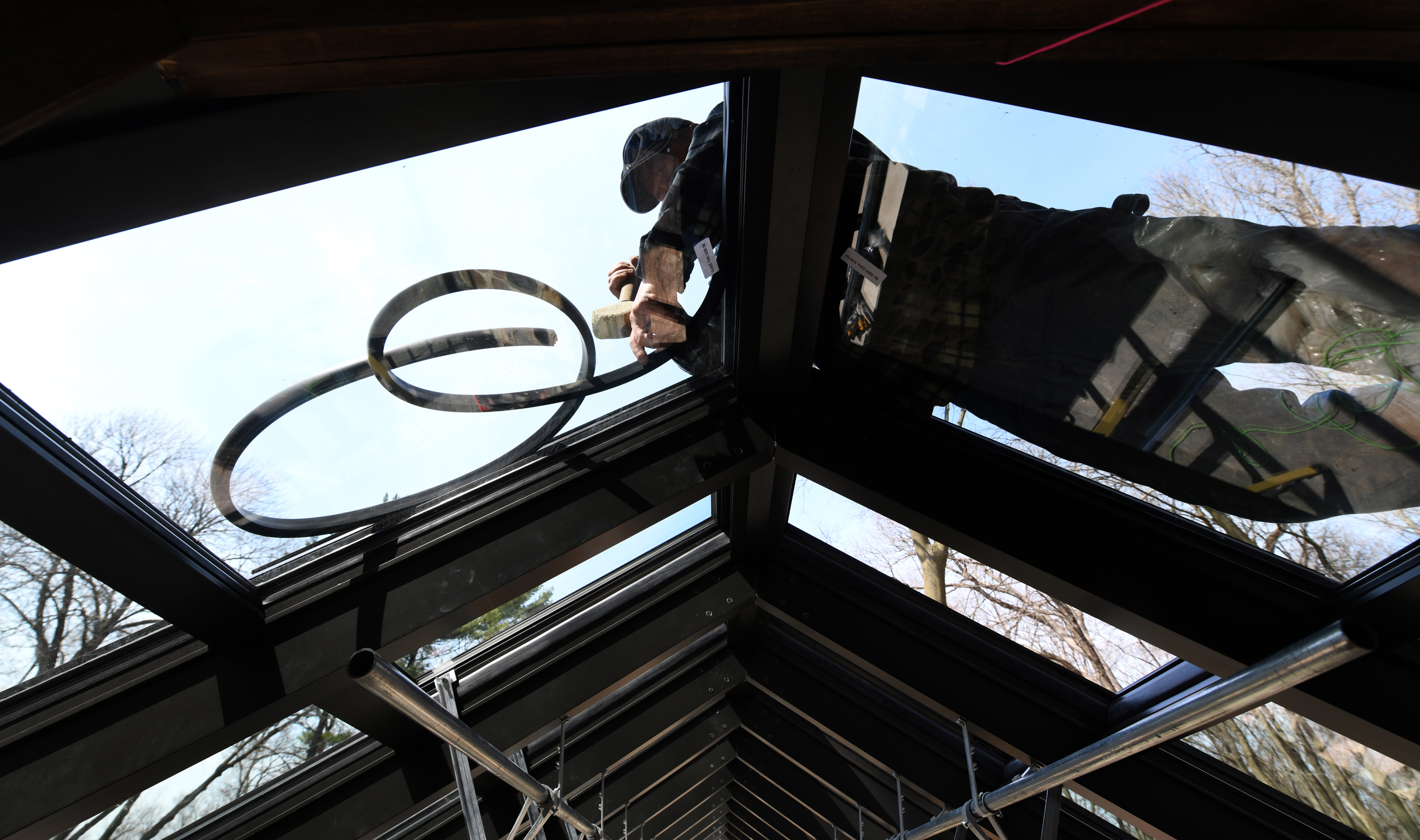 There is once again a greenhouse at the Gate Lodge at Penwern, Frank Lloyd Wright’s Fred B. Jones estate, on Delavan Lake. Workers from Arcadia Glasshouse of Madison, Ohio install the structure which replicates the original one which was taken down in the 1970s, Thursday April 2, 2020. The Gate Lodge and original greenhouse were constructed in 1903. Photos (c) Mark Hertzberg