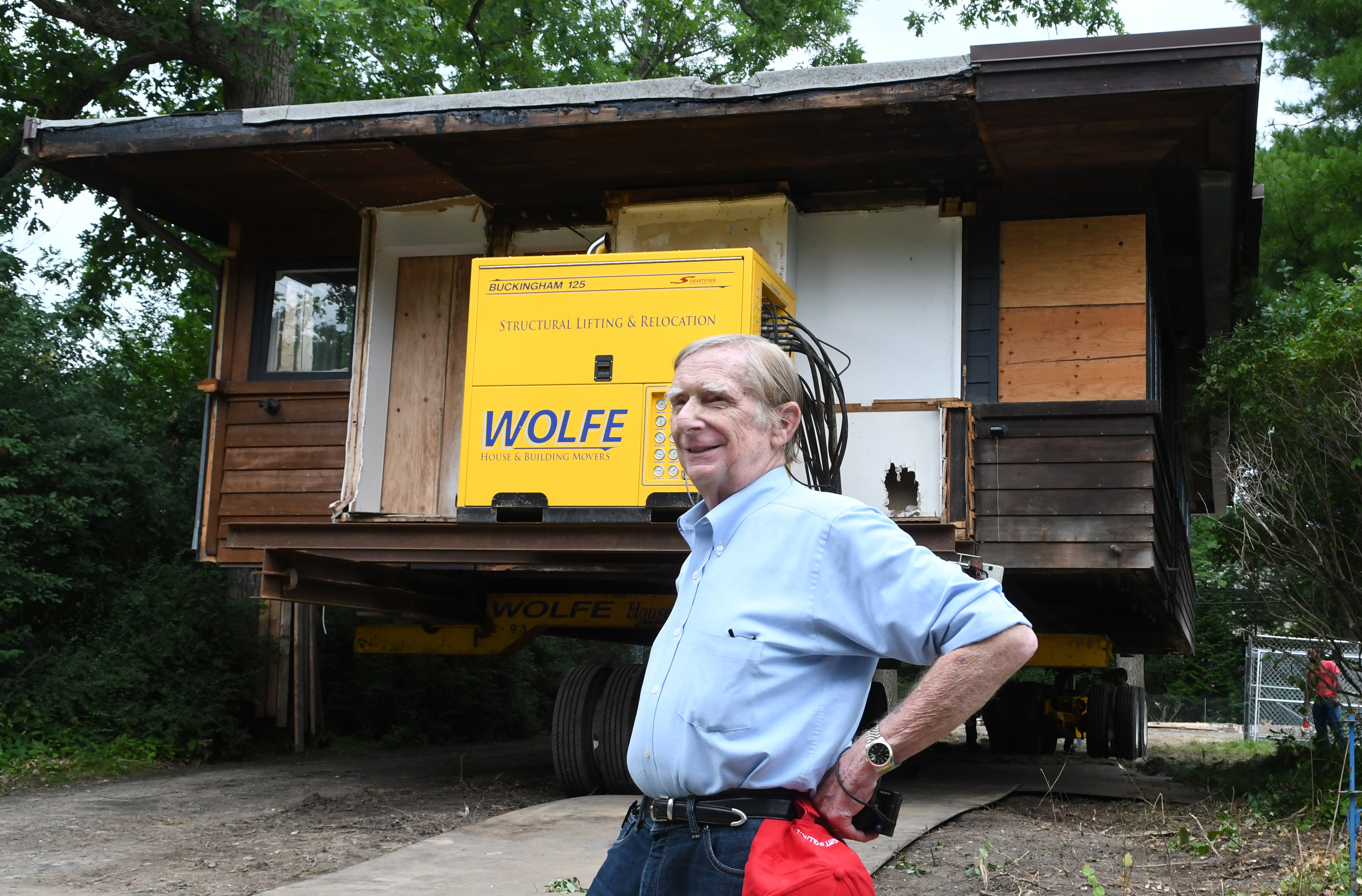Ron Scherubel, former Executive Director of the Frank Lloyd Wright Building Conservancy. The Frank Lloyd Wright – designed Sherman Booth Cottage (1913) which is moved to its new home in a park about one tenth of a mile away in suburban Glencoe, Illinois Tuesday July 21, 2020. The cottage was threatened with demolition by the new owners of the lot it has stood on since 1916. With the help of the Frank Lloyd Wright Building Conservancy, the nonprofit Glencoe Historical Society acquired the home and hopes to remodel it and turn it into a museum and research center. The diminutive home, built for Wright’s attorney Sherman Booth while his larger Wright home was being built nearby, is said by some Wright aficionados to be a precursor to his post-1936 Usonian home designs. There are five other Wright homes in the nearby Ravine Bluffs neighborhood.