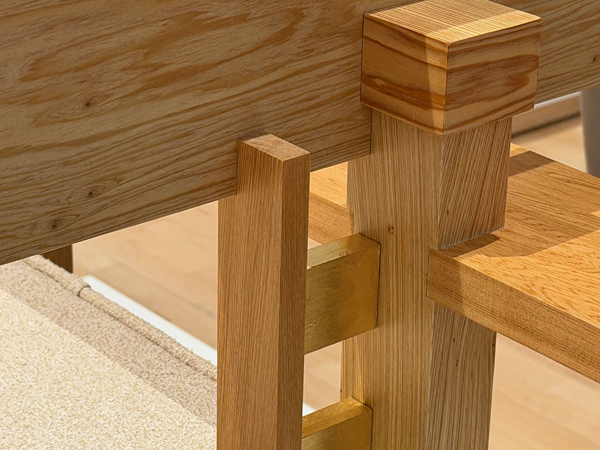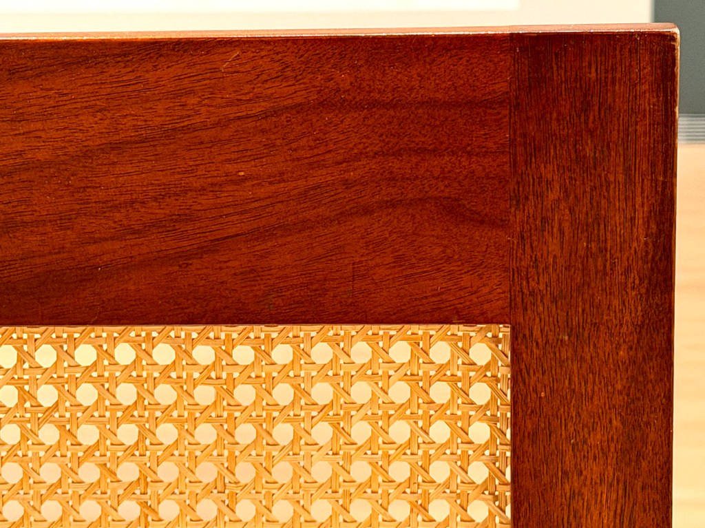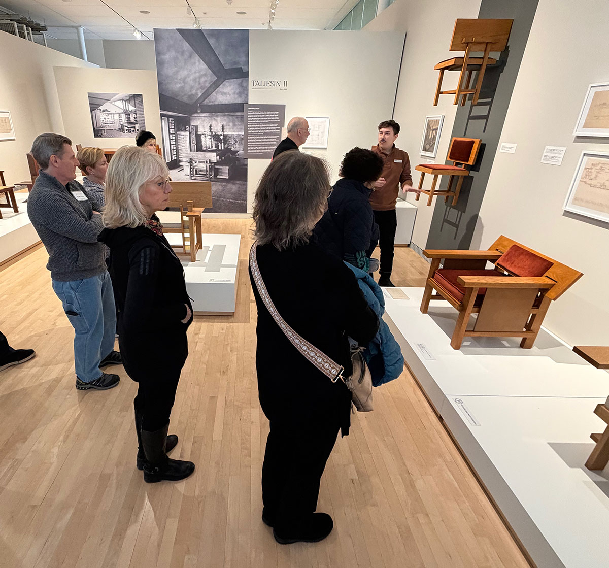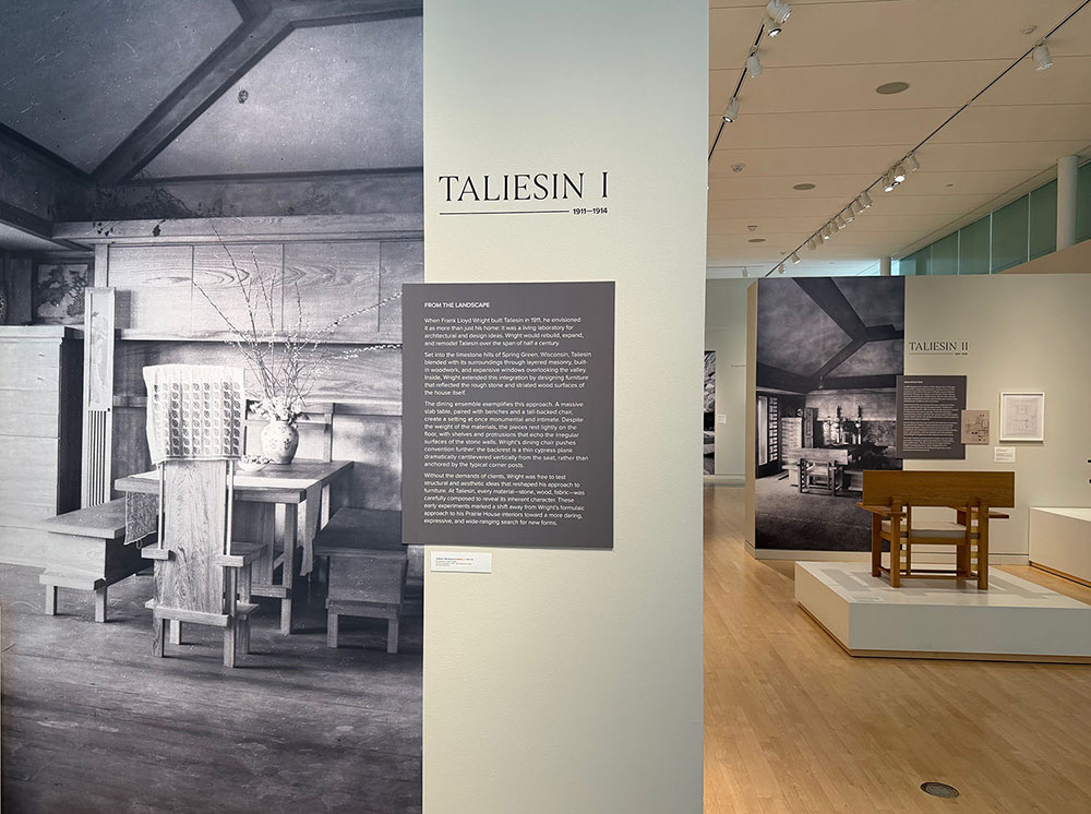 The museum partnered with the Frank Lloyd Wright Foundation to develop the exhibition. The 30 extant pieces were lent by 15 institutions and homeowners, integrating Wright’s furniture with his architecture. Szolwinski said there were three obstacles faced by the curators, “Time, money, and space.” The fabricators of the new pieces were sometimes challenged by ambiguities in the drawings. Using Taliesin as “a lens to see what [Wright] did” the curators looked for lesser known designs, eschewing, for example, the well known pieces designed for the Larkin Building and the SC Johnson Administration Building. Wright designed more flexible furniture beginning in the 1930s, as his house designs became smaller with the leap from Prairie-style to the Usonian designs. This was also some of the earliest use of construction plywood, “It was thin, but strong, and affordable.”