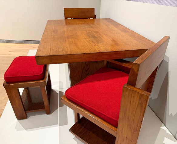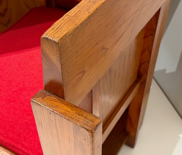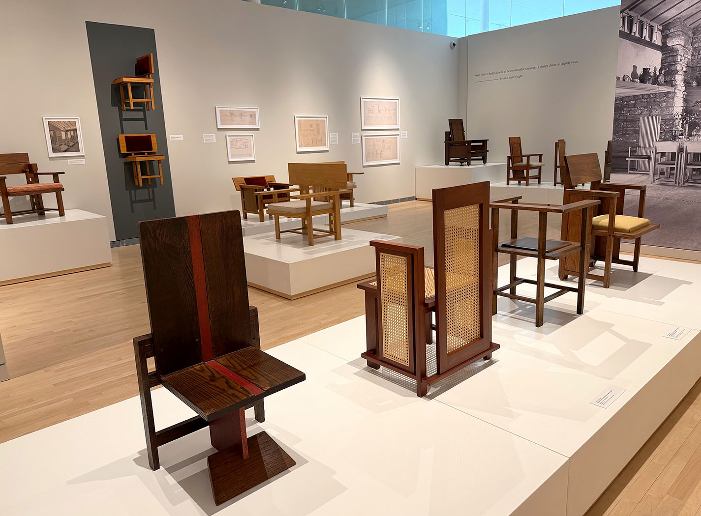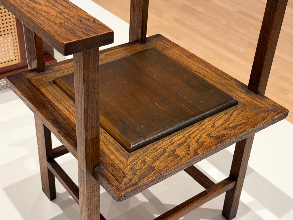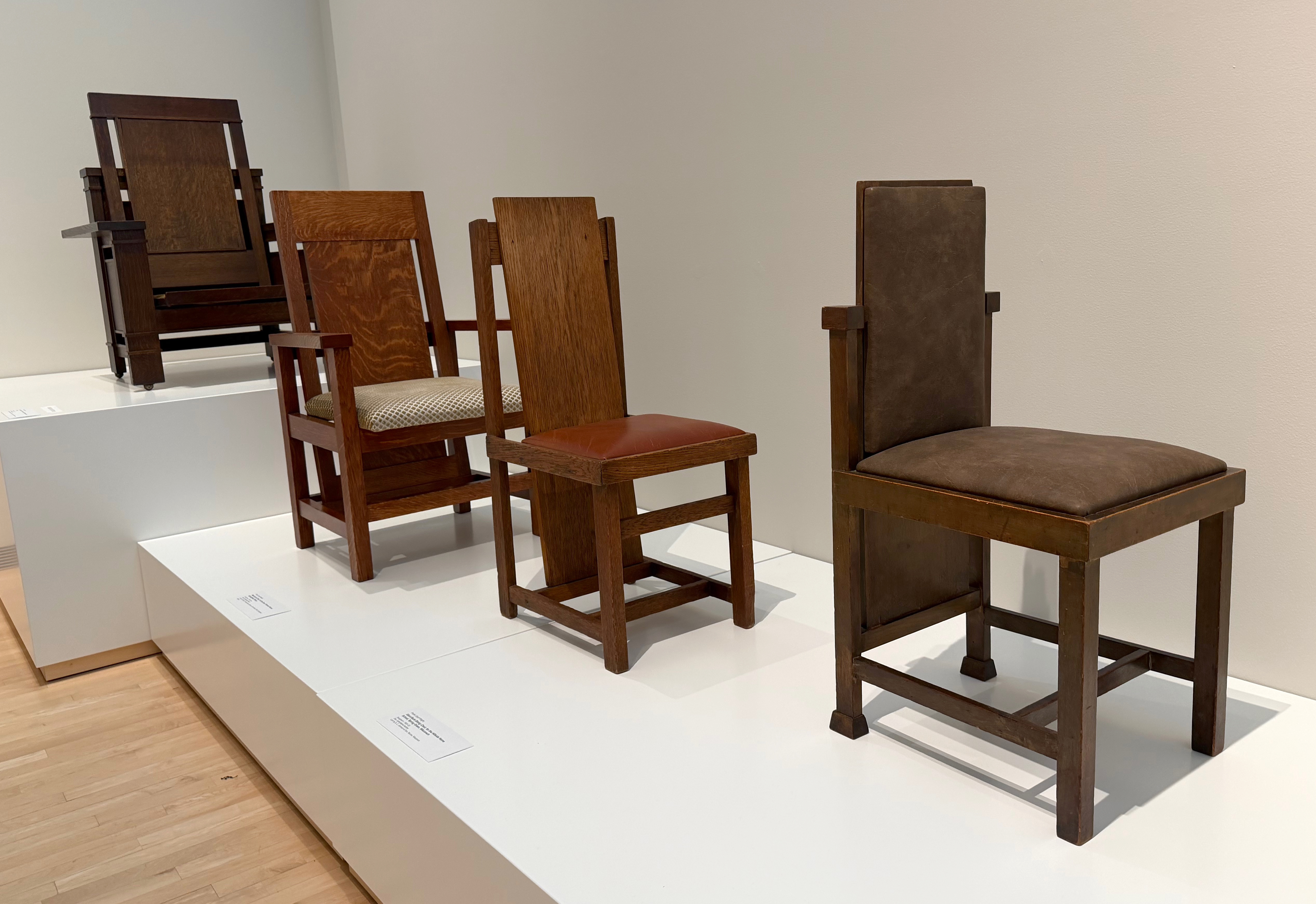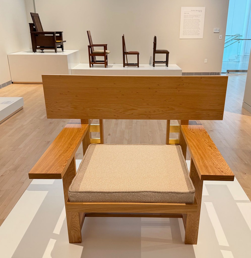 The four pieces at the entry to the show below the quotation from Wright are, from left to right: Easy Chair for Francis W. Little House, Peoria, c. 1903; Musician’s Chair for the Dana-Thomas House, Springfield, c. 1903-1904; Slant Back Chair for the Hillside Home School, Spring Green, c. 1902-1903; and Side Chair for the Avery Coonley Playhouse, Riverside, c. 1912.