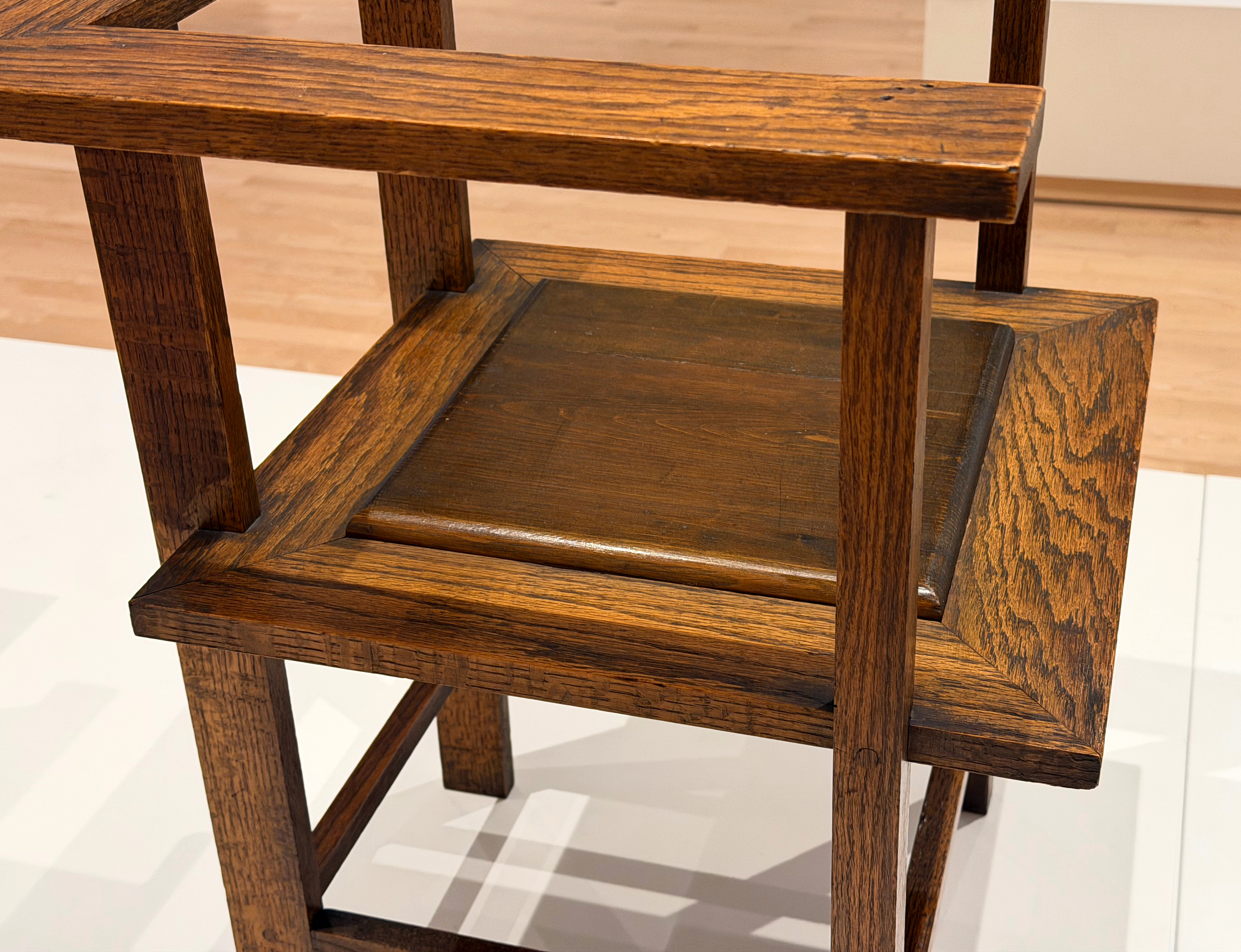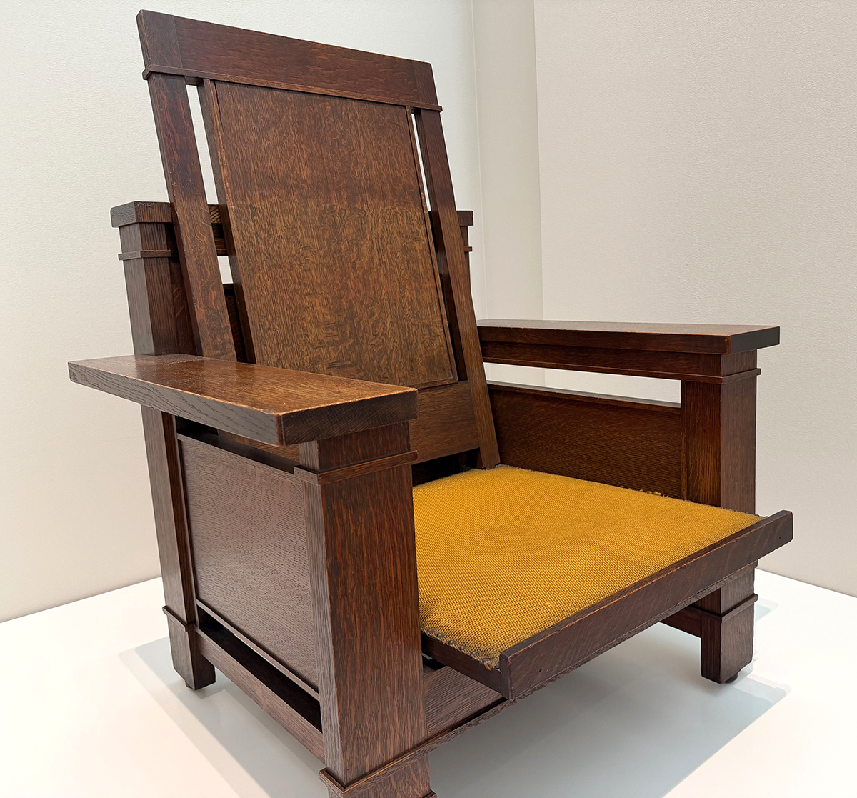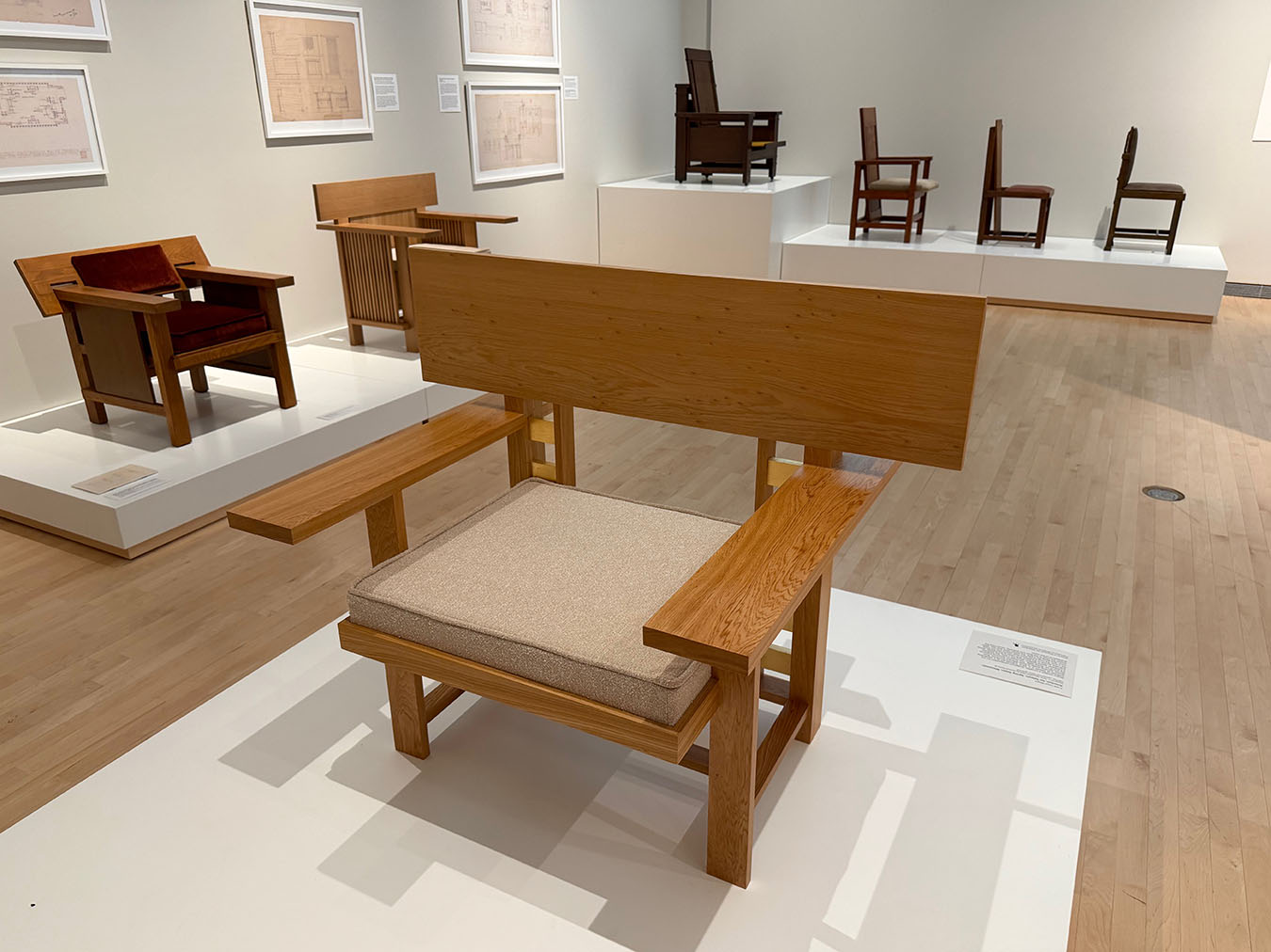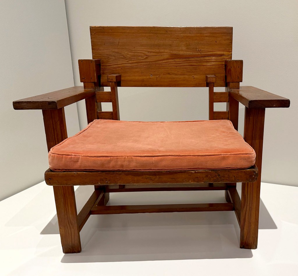 The four pieces at the entry to the show below the quotation from Wright are, from left to right: Easy Chair for Francis W. Little House, Peoria, c. 1903; Musician’s Chair for the Dana-Thomas House, Springfield, c. 1903-1904; Slant Back Chair for the Hillside Home School, Spring Green, c. 1902-1903; and Side Chair for the Avery Coonley Playhouse, Riverside, c. 1912.