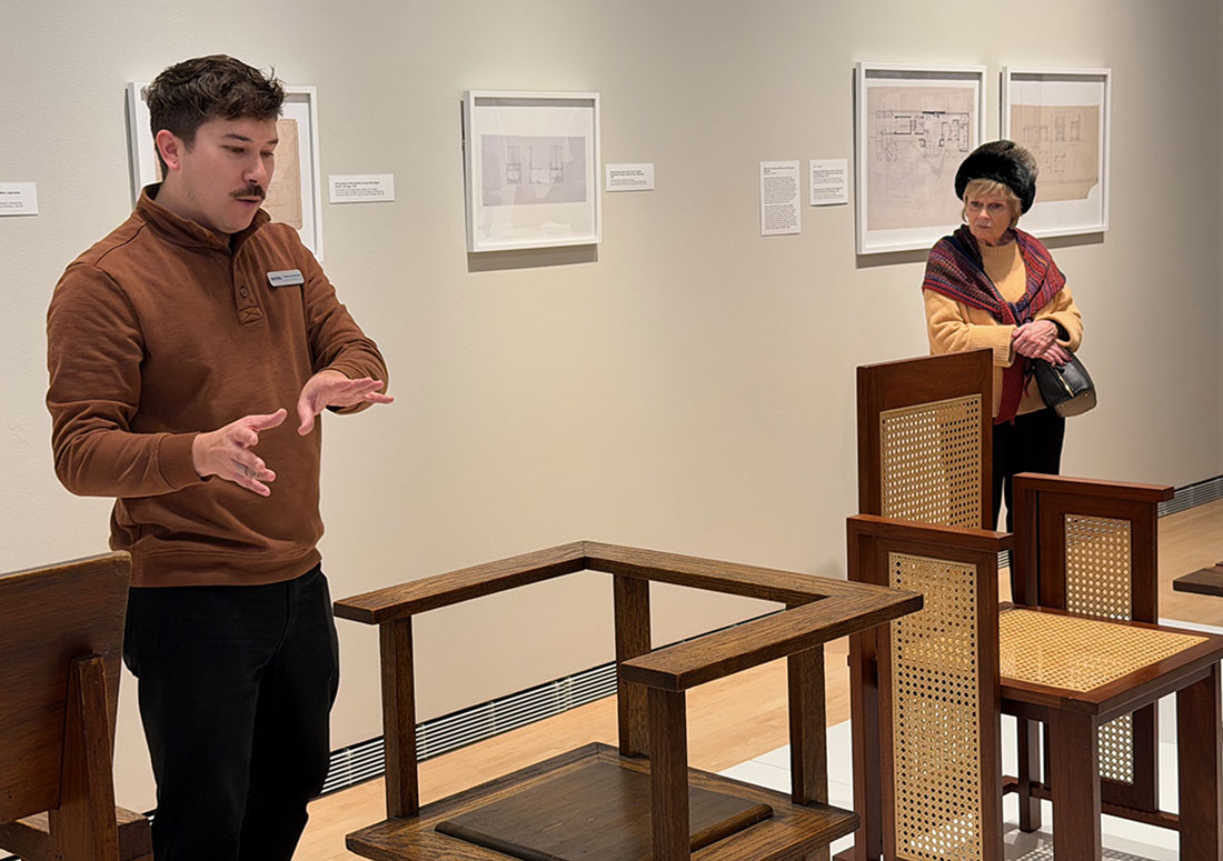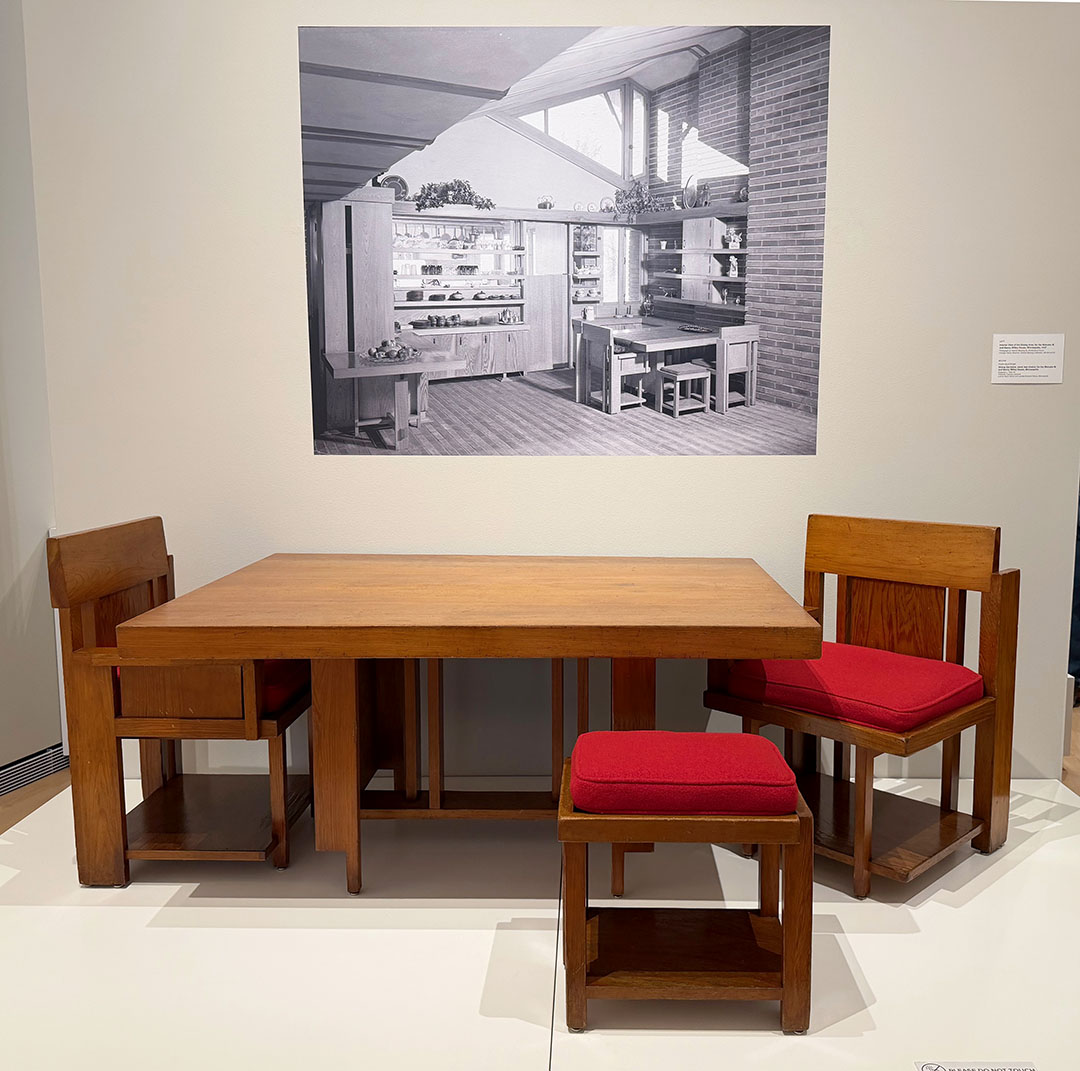 Thomas Szolwinski, MOWA’s Curator of Architecture and Design told guests during a curated tour in January that Wright designed more than 800 pieces of furniture. Some clients elected not to have the furniture built, and some pieces no longer exist. Wright designed “different chairs for different purposes,” noted co-curator Eric Vogel. “Wright was dismissive of his furniture,” and “Wasmuth was not interested in his interiors” for the famous portfolio.