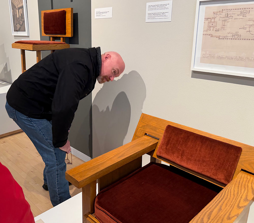 Vogel has examined every one of the Wright furniture drawings. Vogel and Szowinski selected 42 pieces to exhibit. Thirty were located and lent to MOWA. The other dozen were built for the exhibition, meticulously following Wright’s drawings by Current Projects, by Wright’s great grandson  S. Lloyd Natof, and by Stafford Norris III, whose mother and step-father are stewards of Wright’s Malcolm and Nancy Willey House in Minneapolis. They used the drawings to make computer models before making wood models of the pieces. The upholsterer was Chad Alexander Matha. The spun aluminum pieces designed for the Guggenheim Museum were fabricated by Butler Metal Spinning Corp.
