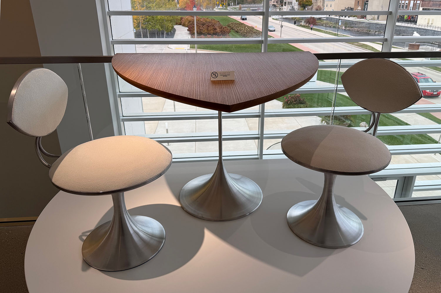 Café Chairs and table for the Solomon R. Guggenheim Museum, New York, designed c. 1957; fabricated 2025 by Butler Metal Spinning Corp.
