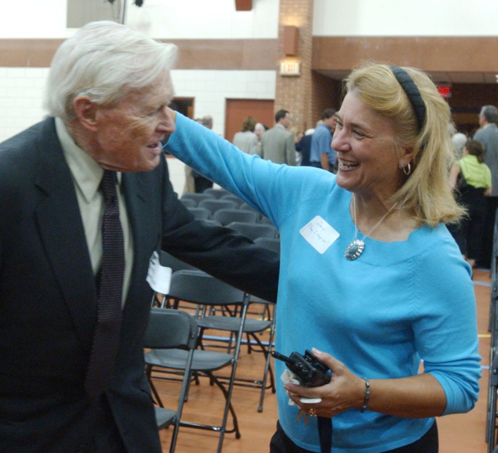 Charles is greeted by Sandy Freres, the school’s longtime athletic director.