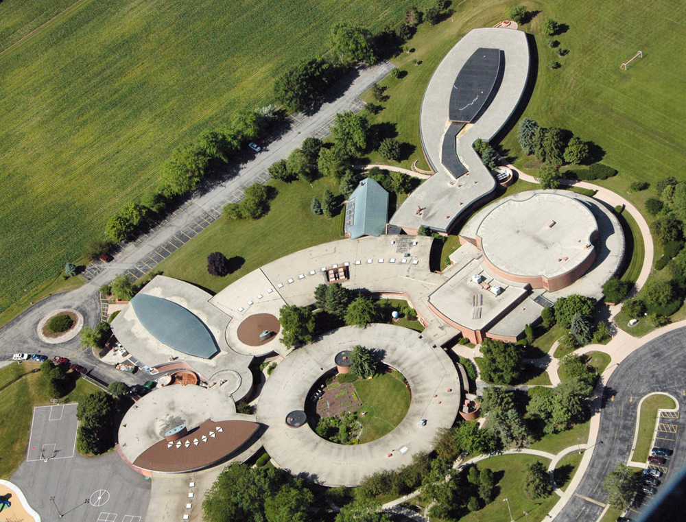 The campus is shown in an aerial photo from 2009. The original school building was a semi-circular portion of the circular building at lower left.
