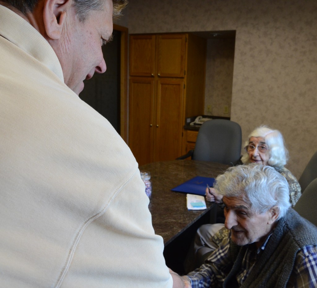 Dave Archer greets Anne Sporer Ruetz who last saw Archer was he was 8.