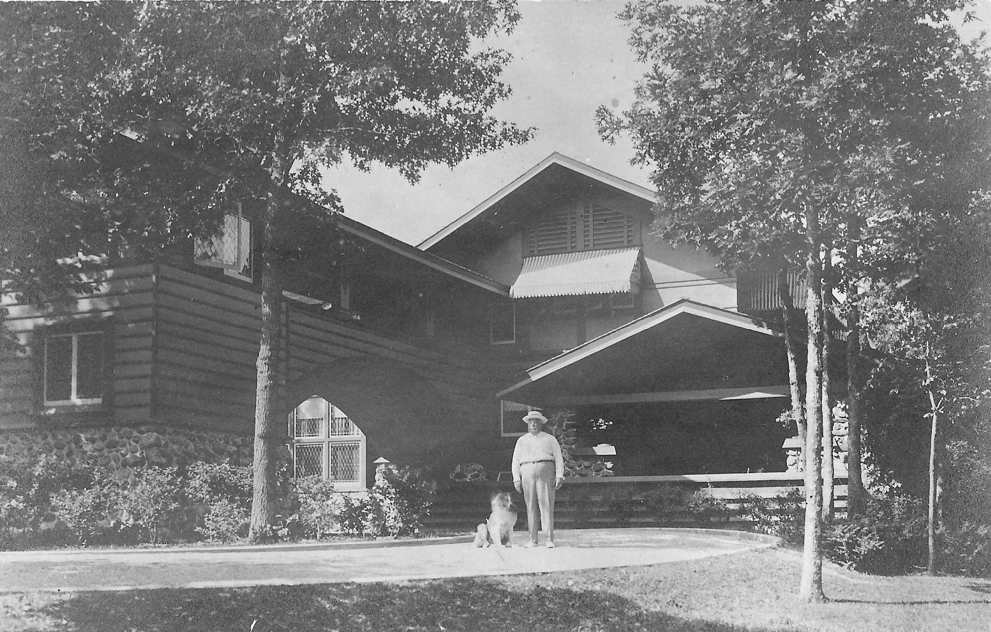 Frank Lloyd Wright designed semi-circular outer porch walls for Penwern, the Fred B. Jones House on Delavan Lake, Wisconsin (1900-1903), but the walls were either built straight or modified from his plans early in the life of the house. Jones is shown near the straight east porch wall in an undated photograph. The house was completed in 1901; he died in 1933.