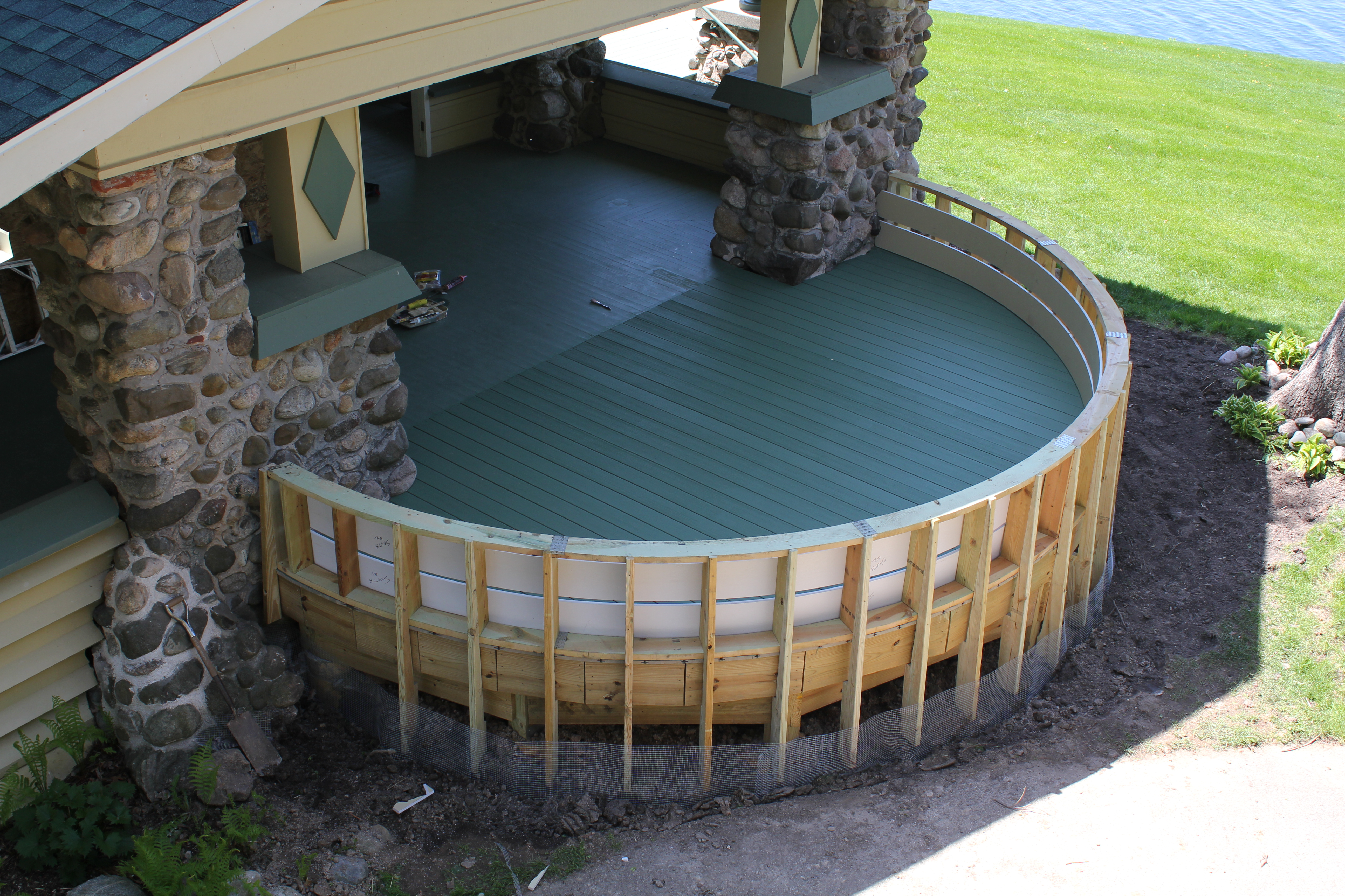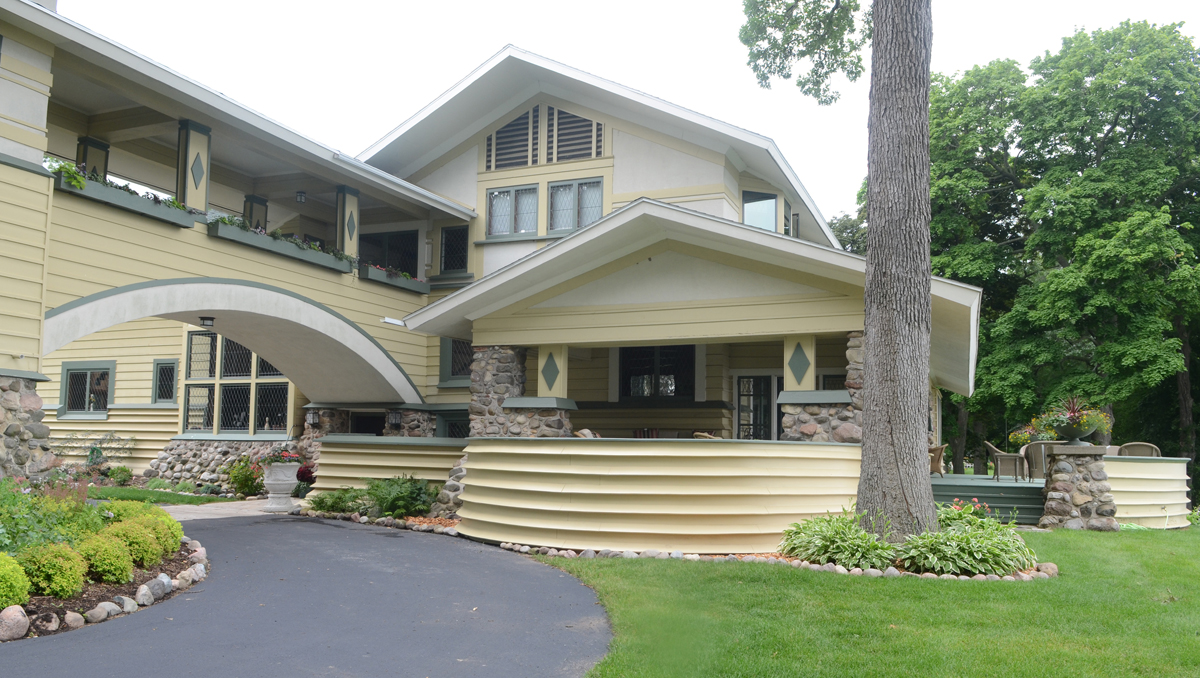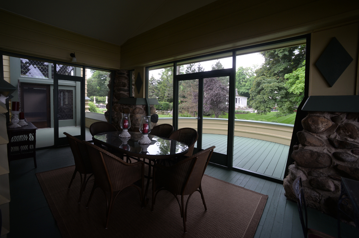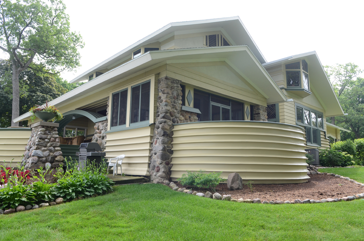 The east and west (side) porches now have semi-circular outer walls, as indicated on Wright’s drawings for the house. (The drawings can be viewed on Penwern’s magnificent website, www.penwern.com ) Sue and John Major, stewards of Penwern since 1994, commissioned master builder Bill Orkild to rebuild the side porches to Wright’s plan this spring. The work was completed just a week ago. The outer wall of the front porch, facing the lake, was changed from straight to semi-circular by John O’Shea, the fourth owner of the house, between 1989 and 1994. The front porch is on the right side of the first photo below: