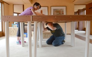 It is almost inconceivable to think of Wright agreeing to have another architect looking over his shoulder, but Karen said he did not balk when Johnson assigned John Halama, the company architect, to supervise the job. Halama and Wright had already worked together on the Johnson Research Tower and other projects. When the Kelands also hired consultants from the University of Indiana to help design the home’s radiant heating system, something her father recommended because of problems with Wingspread’s system, she says that “Mr. Wright never said ‘boo’ about it…I think Mr. Wright was relieved he didn’t have to do it.”