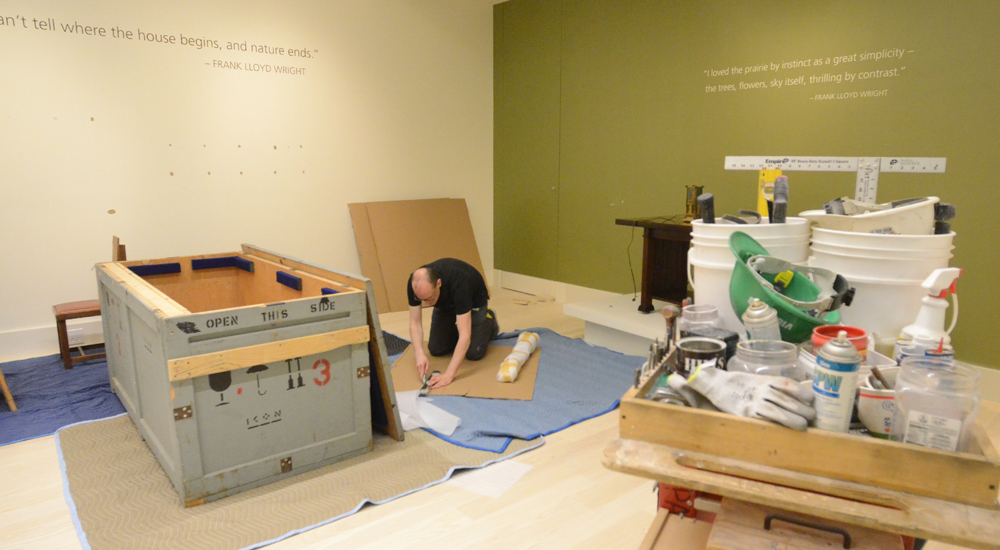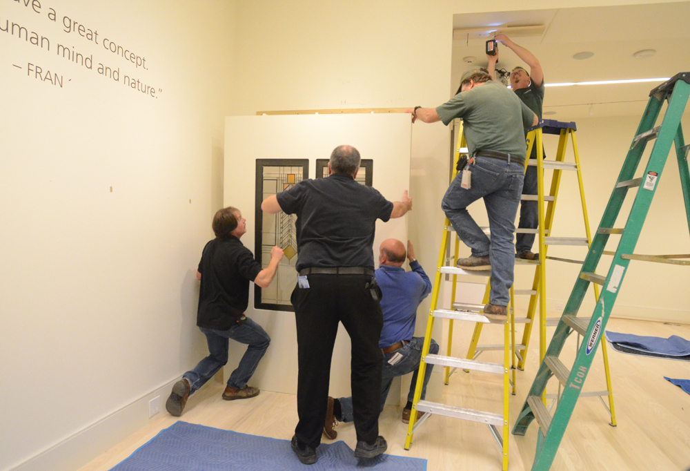 Robert Maushammer studies a skylight grill from the Avery Coonley house in Riverside, Illinois (ca. 1909).
