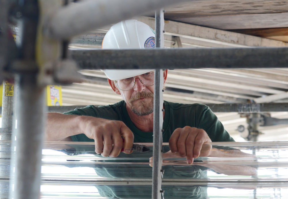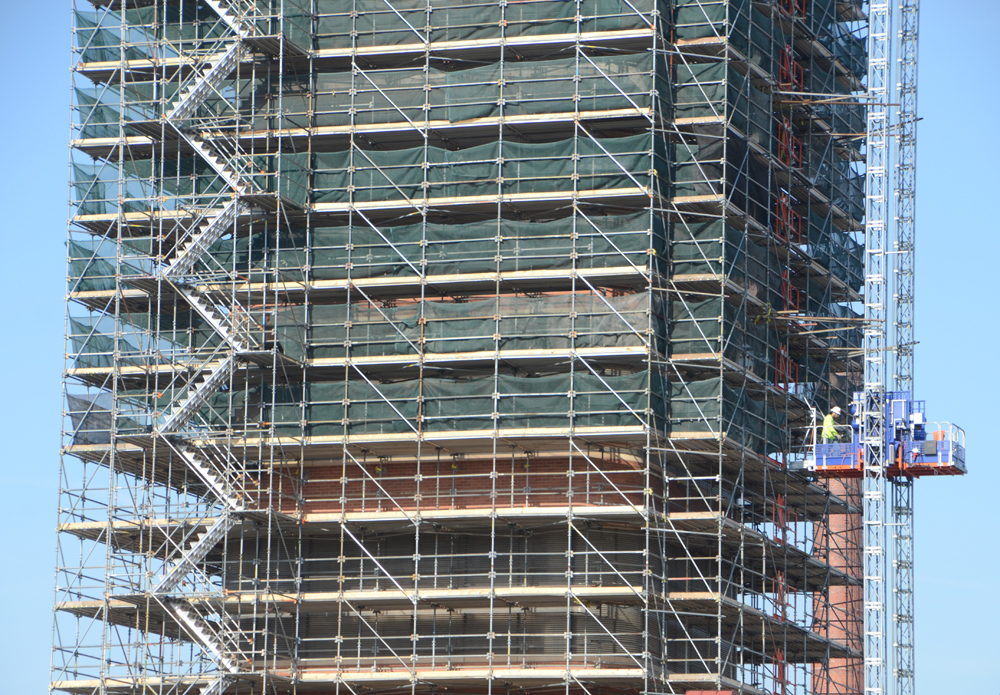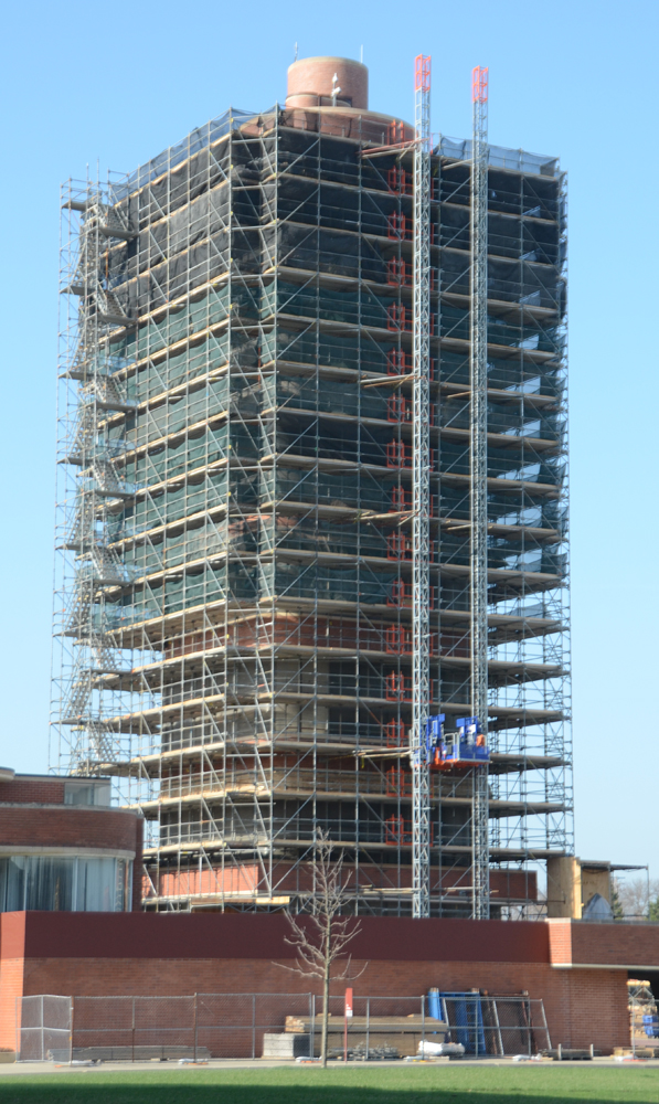 The Tower is enveloped in scaffolding, as workers tuck point the brickwork and clean the 17.5 miles of glass tube windows in preparation for reopening the building. Windows tubes will be replaced, as necessary.