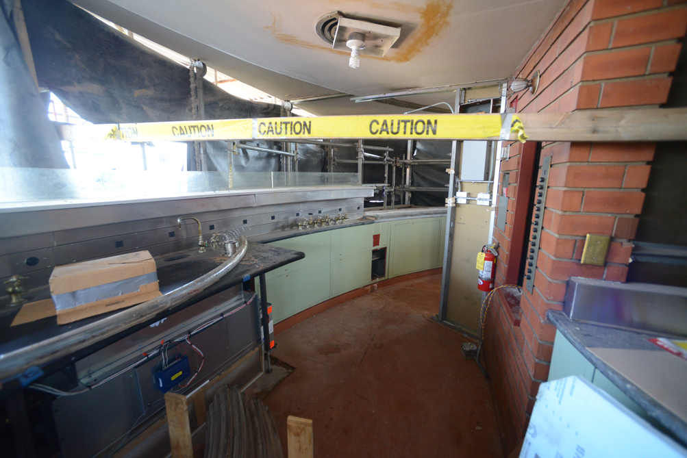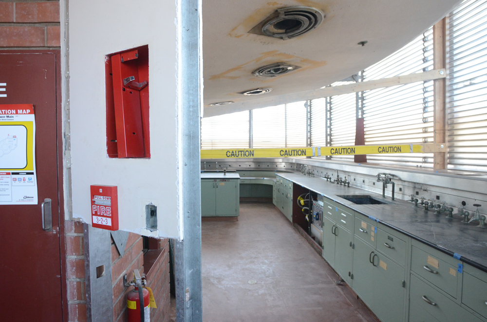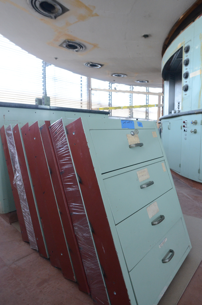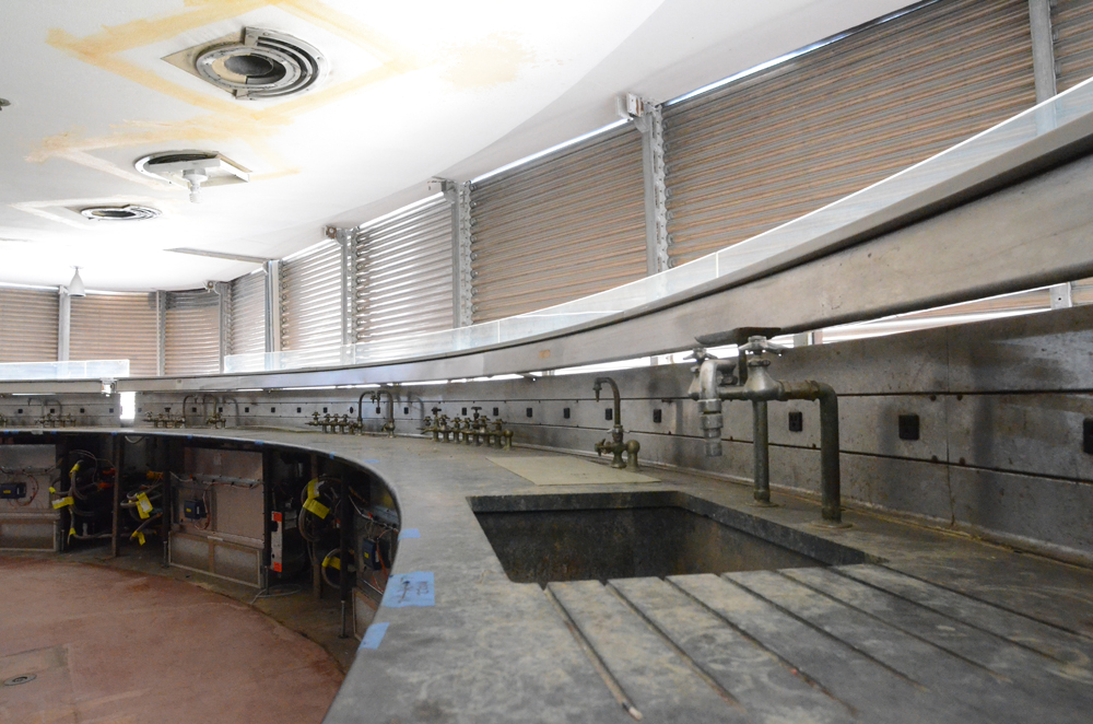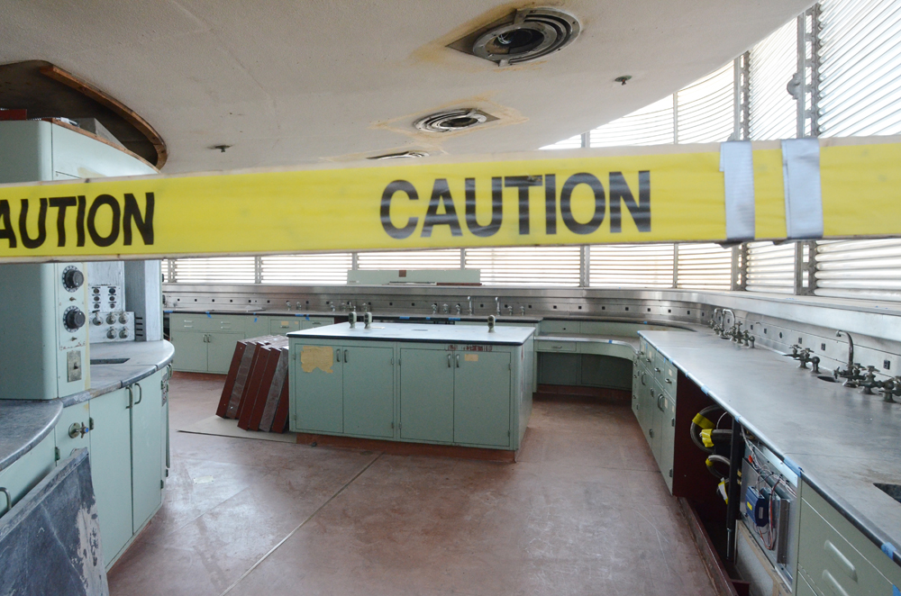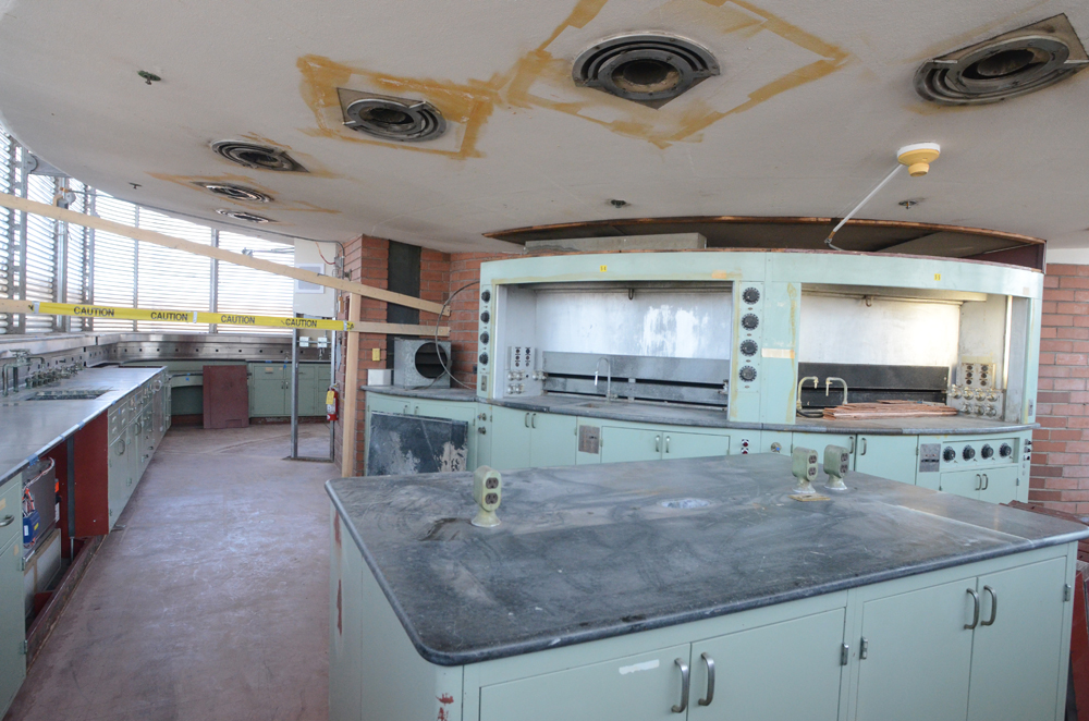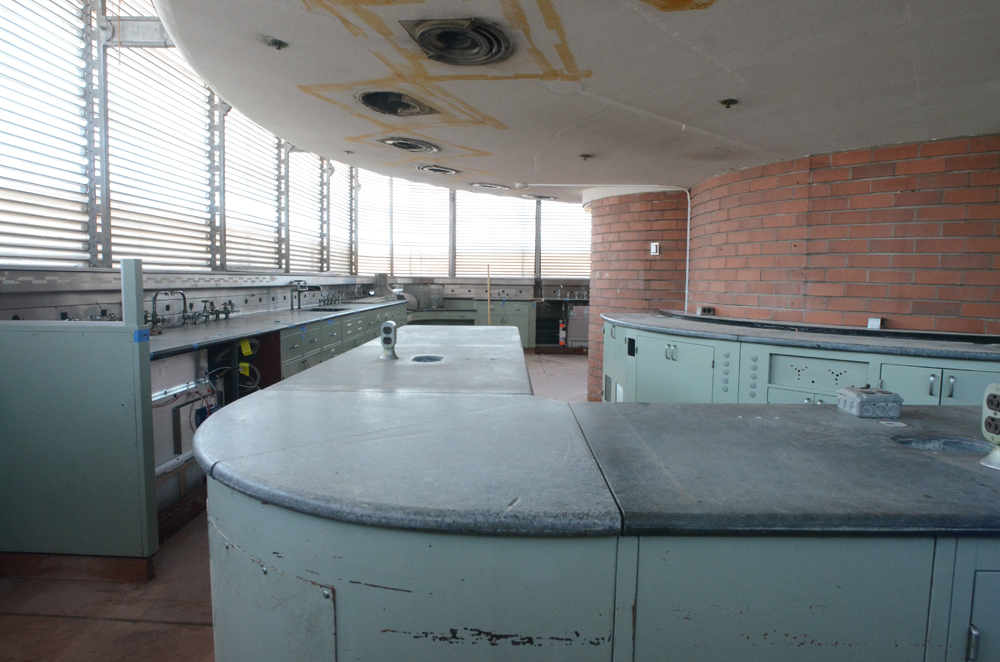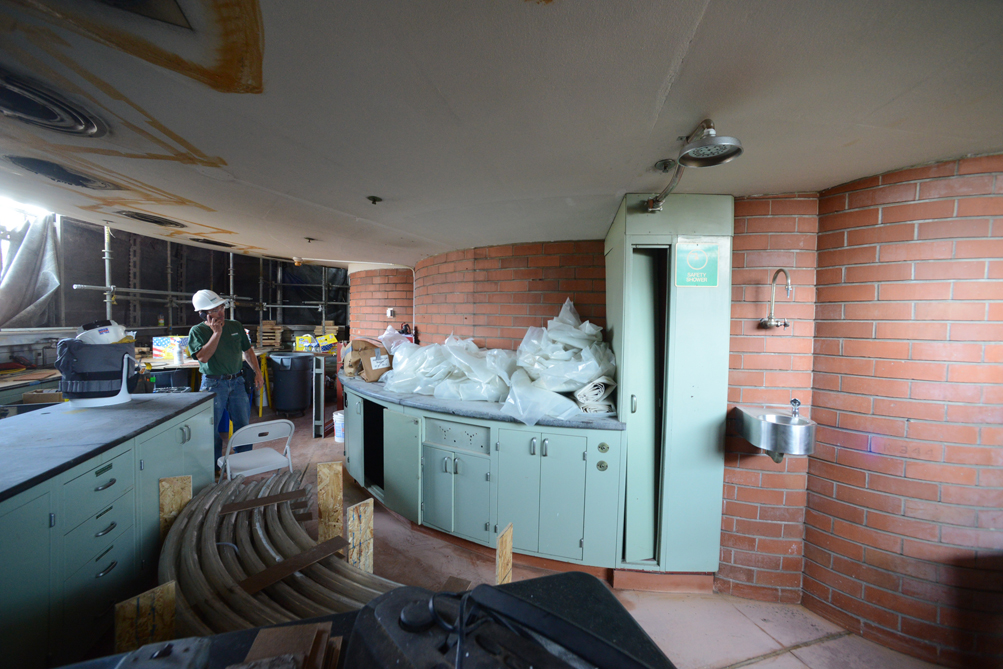 Although the Tower has been closed for longer than it was open, it has remained lit at night, as a symbol of the company’s commitment to creativity. In recent years the soft lighting has come from a multitude of three-foot fluorescent lights placed on the lab counters, and facing up. Those lights have been removed, and the Tower’s original lighting will be replicated. The new lights will be in the restored ceiling light fixtures:
