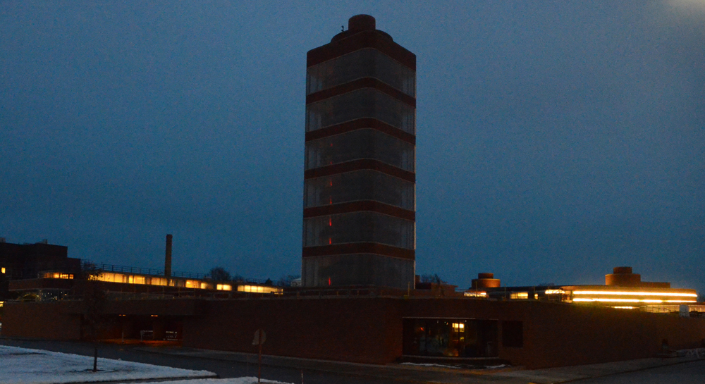 The landmark Tower, which was built after World War II, opened in November, 1950. It closed in 1981, when the bulk of Johnson’s research and development was moved into the nearby Louis Laboratories, the former St. Mary’s Hospital building. The Tower closed for two reasons. It could not be expanded to meet the company’s growing research needs. The “carport labs” opened in the courtyard carport in 1957, the first indication that the Tower space was not adequate.