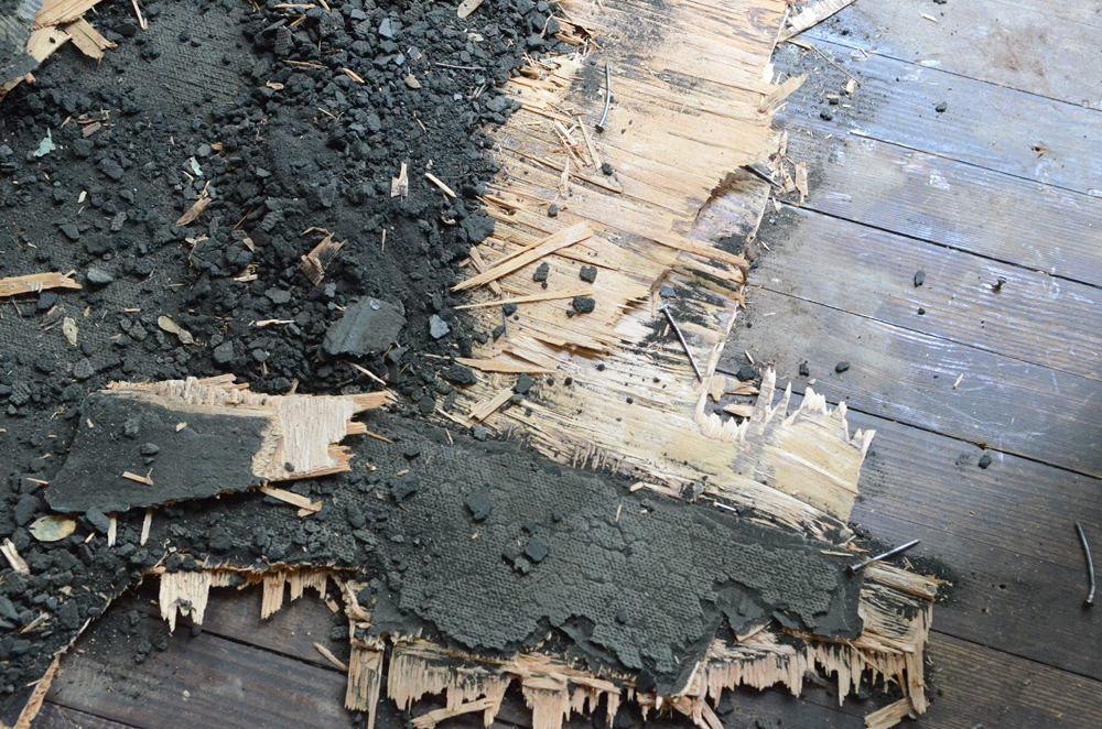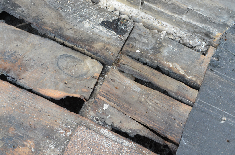 The roofers found charred beams, which were evidence of a previously undocumented fire.