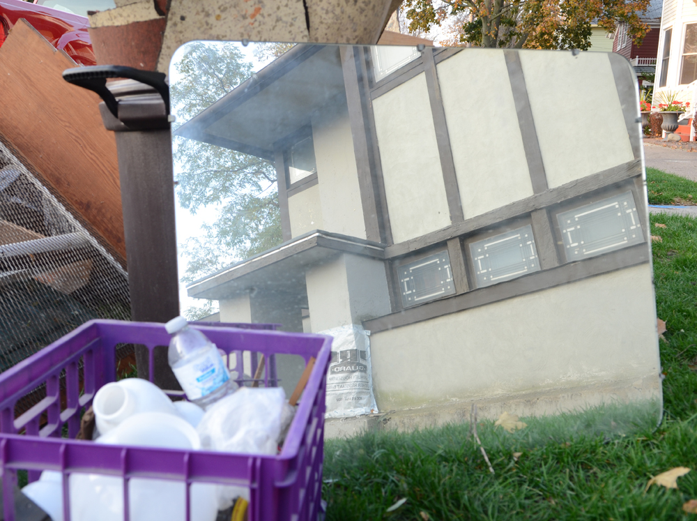 The Hardy House is reflected in a mirror left curbside with other items being thrown away during restoration of the house: