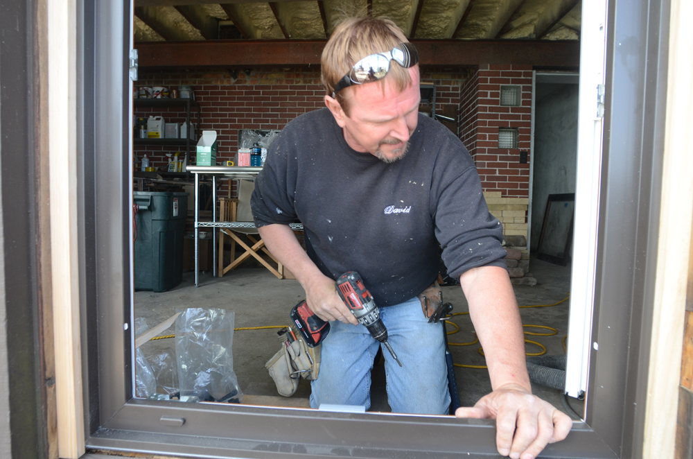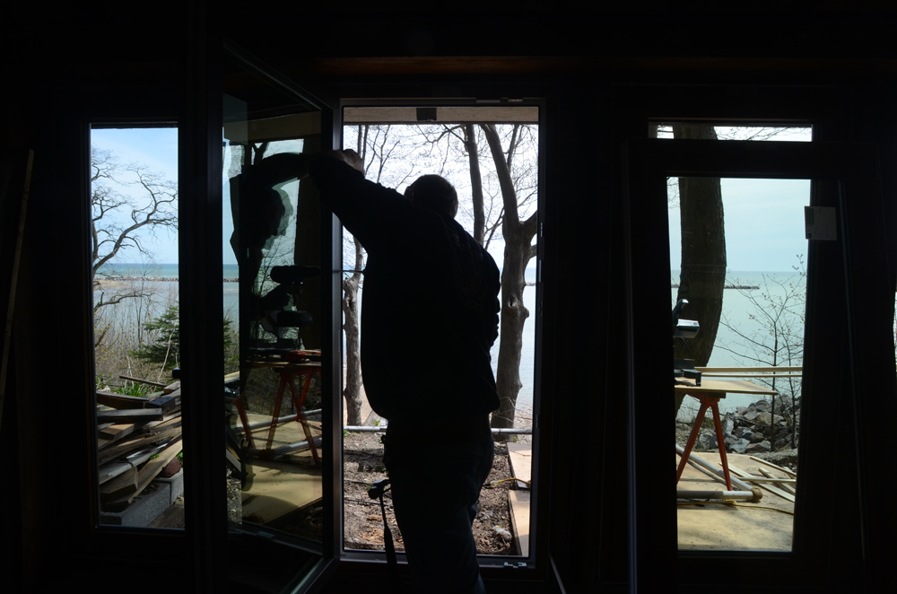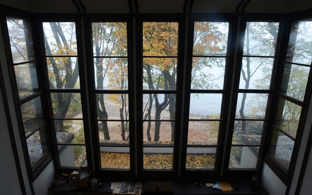 The second owners of the house – The Sporers, 1938-1947 – commissioned a recreation room to be built under the dining room terrace, adjacent to the basement, in 1941. The work was done after World War II. It included replacing the solid east stucco wall under the terrace with five full-length windows, one of which was a door opening to the hill above Lake Michigan. David Sinkler installed new energy-efficient windows in May.