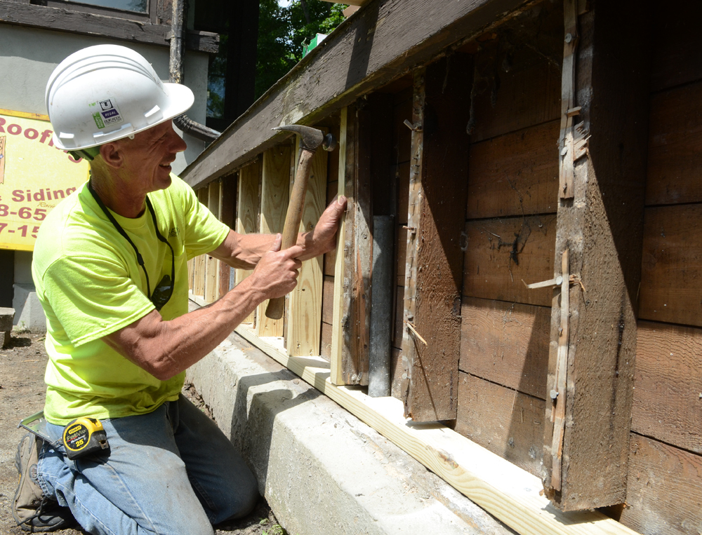 Below, Sunderland works in a basement crawl space to shore up the sagging floor of the servant’s bedroom above him. That room is on the south side of the dining room, opposite from the kitchen.