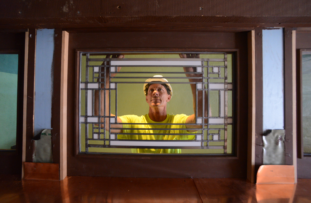 I had just come back from looking at the home’s seven hallway windows with Joan Szymczak (owner Eugene Szymczak’s sister-in-law) at Paul Phelps’ Oakbrook Esser glass art studios in Oconomowoc, Wisconsin. Phelps explained that the windows are too badly damaged from previous repair to restore. The original windows will be saved, but he will build replicas (Szymczak and Phelps are framed in one of his reproduction Robie House windows in the first photo).
