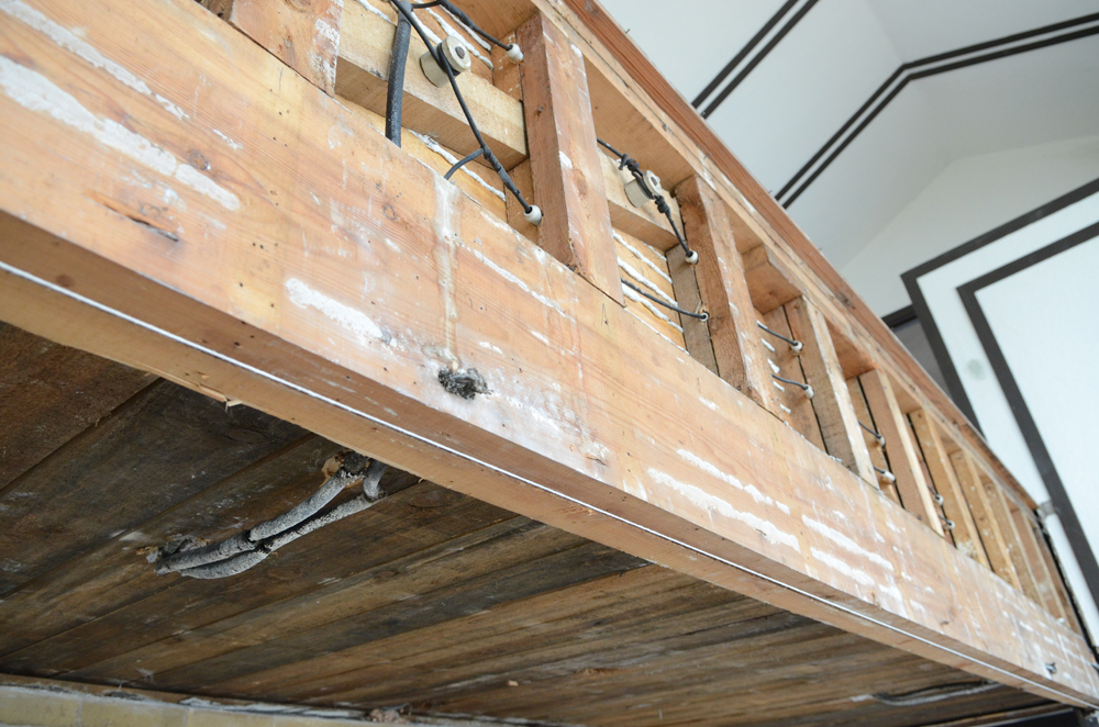 The living room balcony was deflected. The plaster face was removed so the balcony could be leveled. Electric wiring found on the face of the balcony tells us that there may once have been two light fixtures on it. Anne Sporer Ruetz and Mary Hill, who often played in the house, have good memories for details, but they do not recall the lights. We surmise that Mr. Hardy removed them at some point, or else while they were wired, they were never installed.