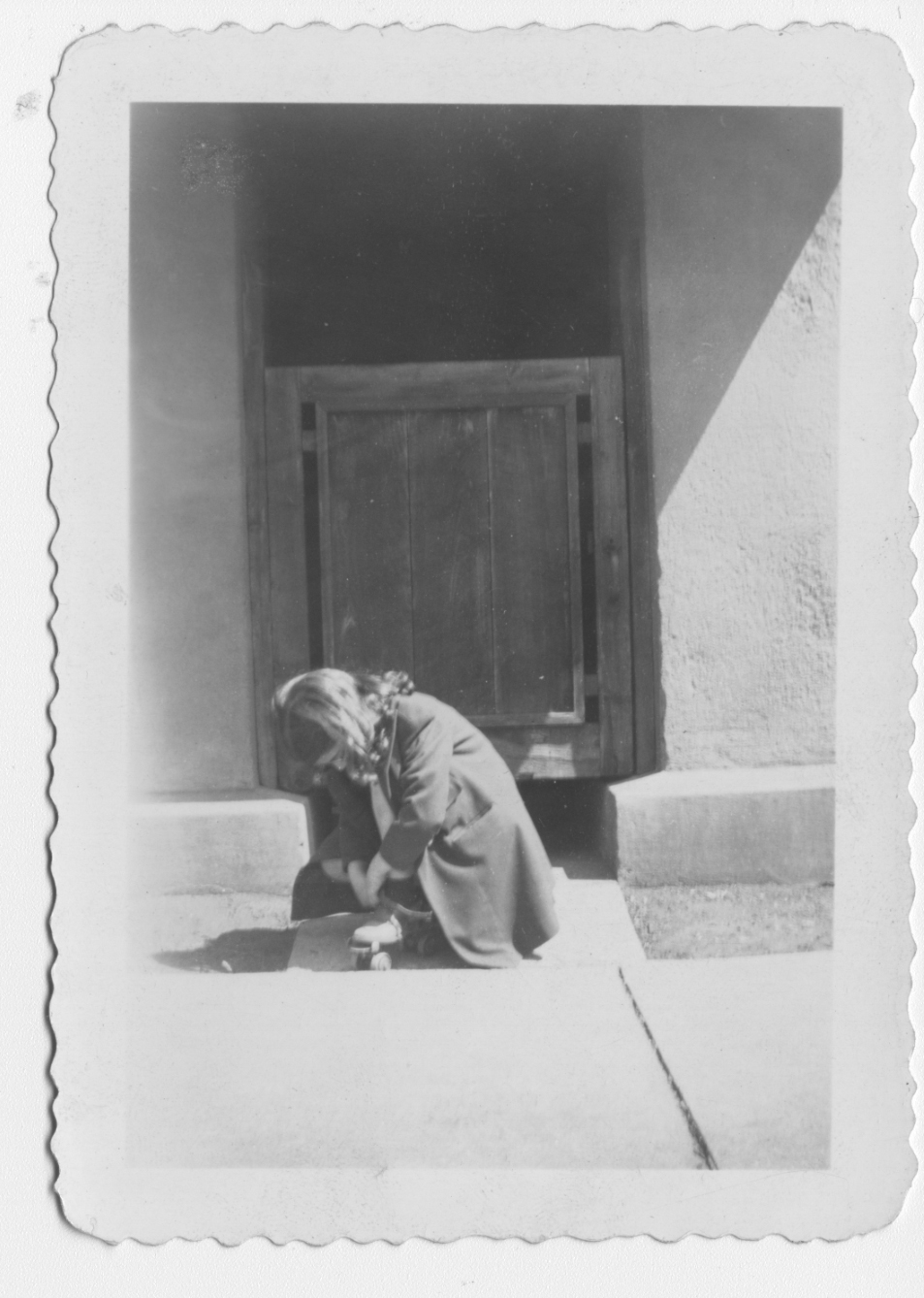 The house originally had two pocket (sliding doors), on either side of the entry hall. The entry ways to the doors had wood gates across them. The third owners of the house (1947-1957) took out the pocket doors because they would ice up. We do not know who removed the gates. Anne Sporer Ruetz, whose parents bought the house in 1938, took this picture of her friend Mary Hill putting on her roller skates in front of one of the gates: