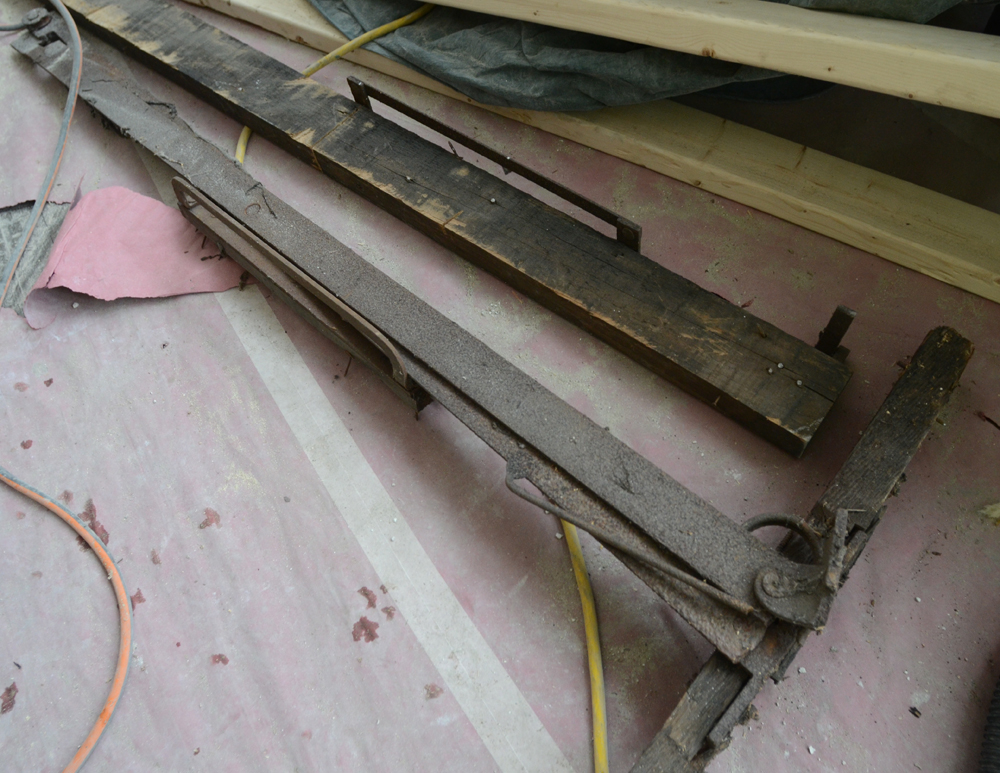 ImageThe pocket doors will be trickier, but the original mechanisms were found two weeks ago. The hardware for the north door is now on the living room floor, the hardware for the south door is still mostly in concrete in the doorway (although it is hanging down):