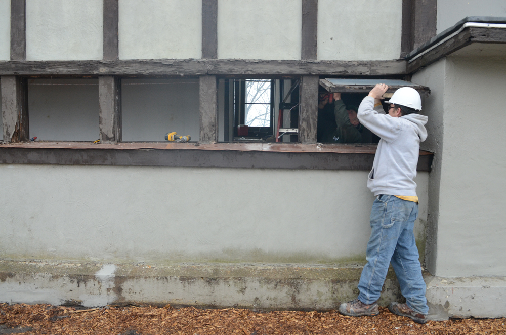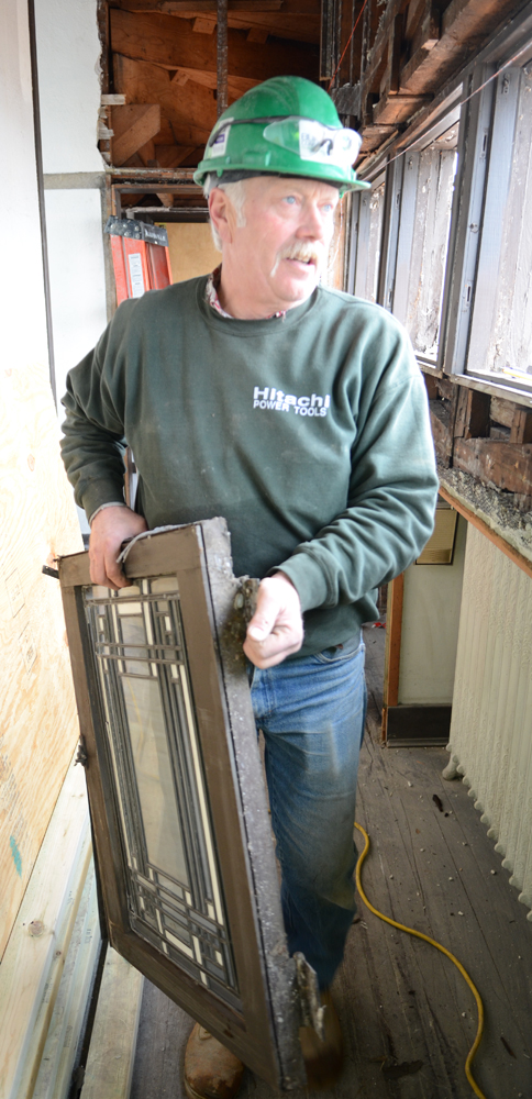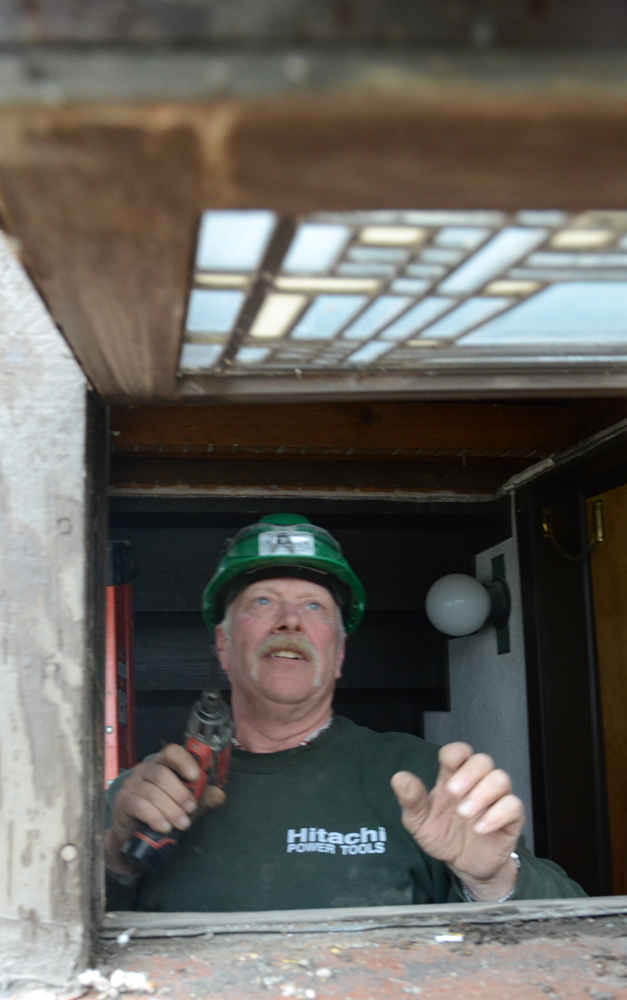 The leaded glass windows on the Main Street elevation of the house were removed by Grant and Paul Harvey to ensure that they did not crack when the jacks in the Heater Room were tightened during the stabilization of the Main Street elevation: