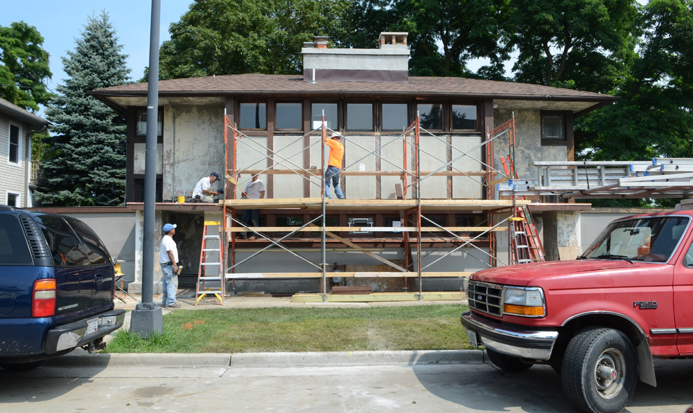 Interest in the house has increased greatly recently, according to the craftsmen working on it, as passersby see the finish color of terra cotta applied. Szymczak reflects on the past year, and says, “I am happy to see that many people enjoy seeing the house come back to its original intent of being part of nature and an inspiration.” The Hardy House will be open for a rare tour during Preservation Racine’s annual fall house tour Sunday September 29. For more information: http://www.preservationracine.org/tour2013.html