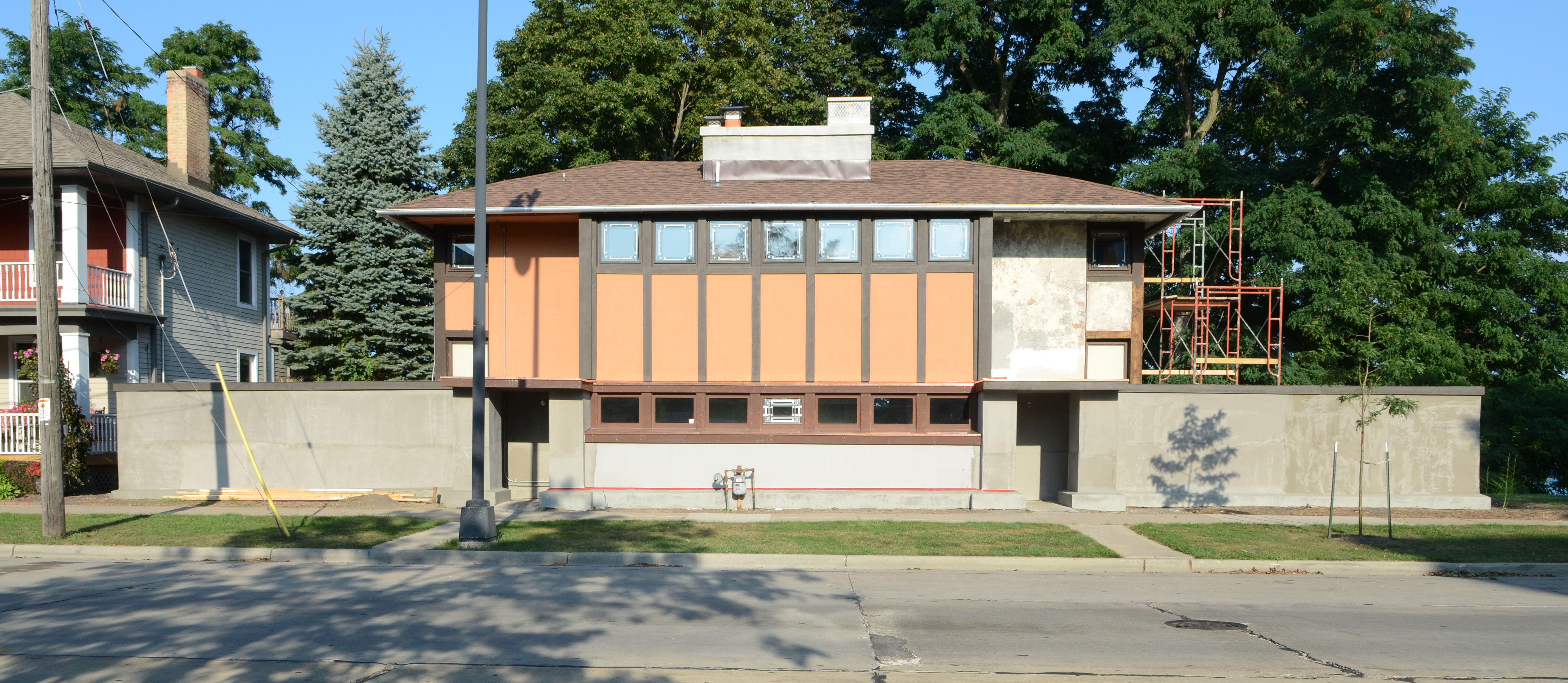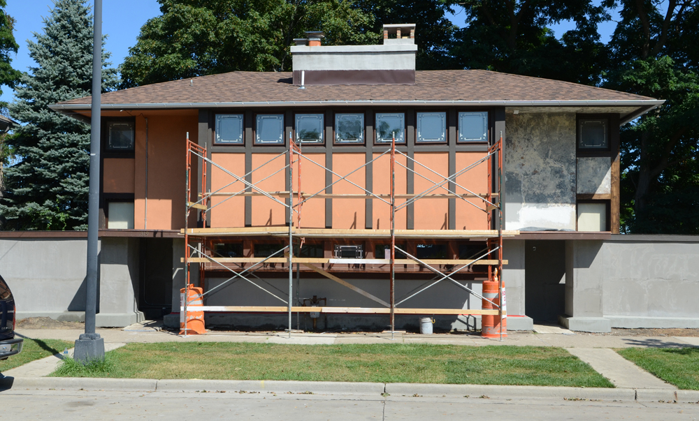 And, the final color…drum roll…terra cotta, like Wright’s Gardener’s Cottage at the Darwin D. Martin House. The color is the final coat of the meticulous stucco repair by Paul Lemke of Top Notch Plastering of Racine, and his nephew, Sean Doyle: